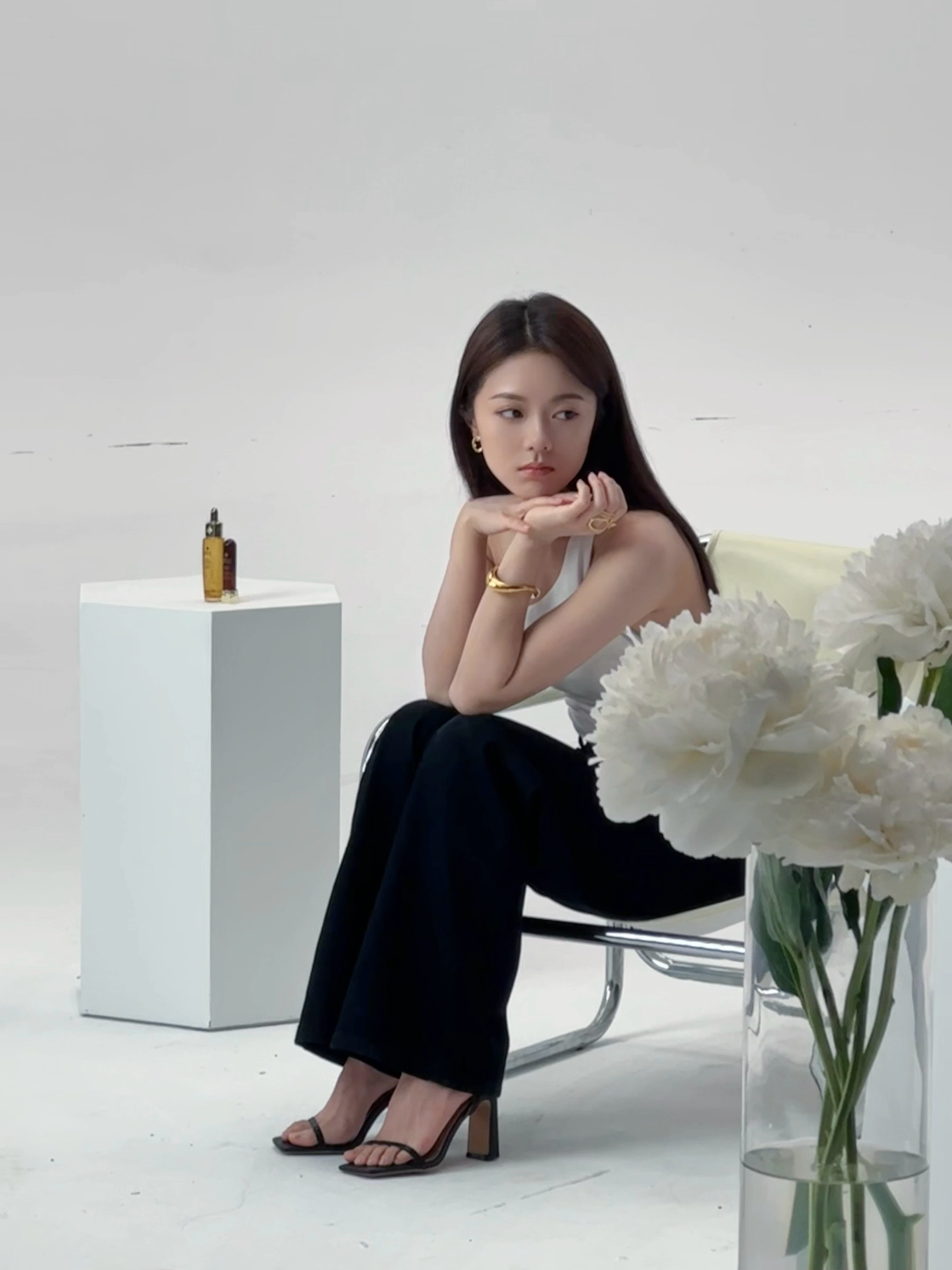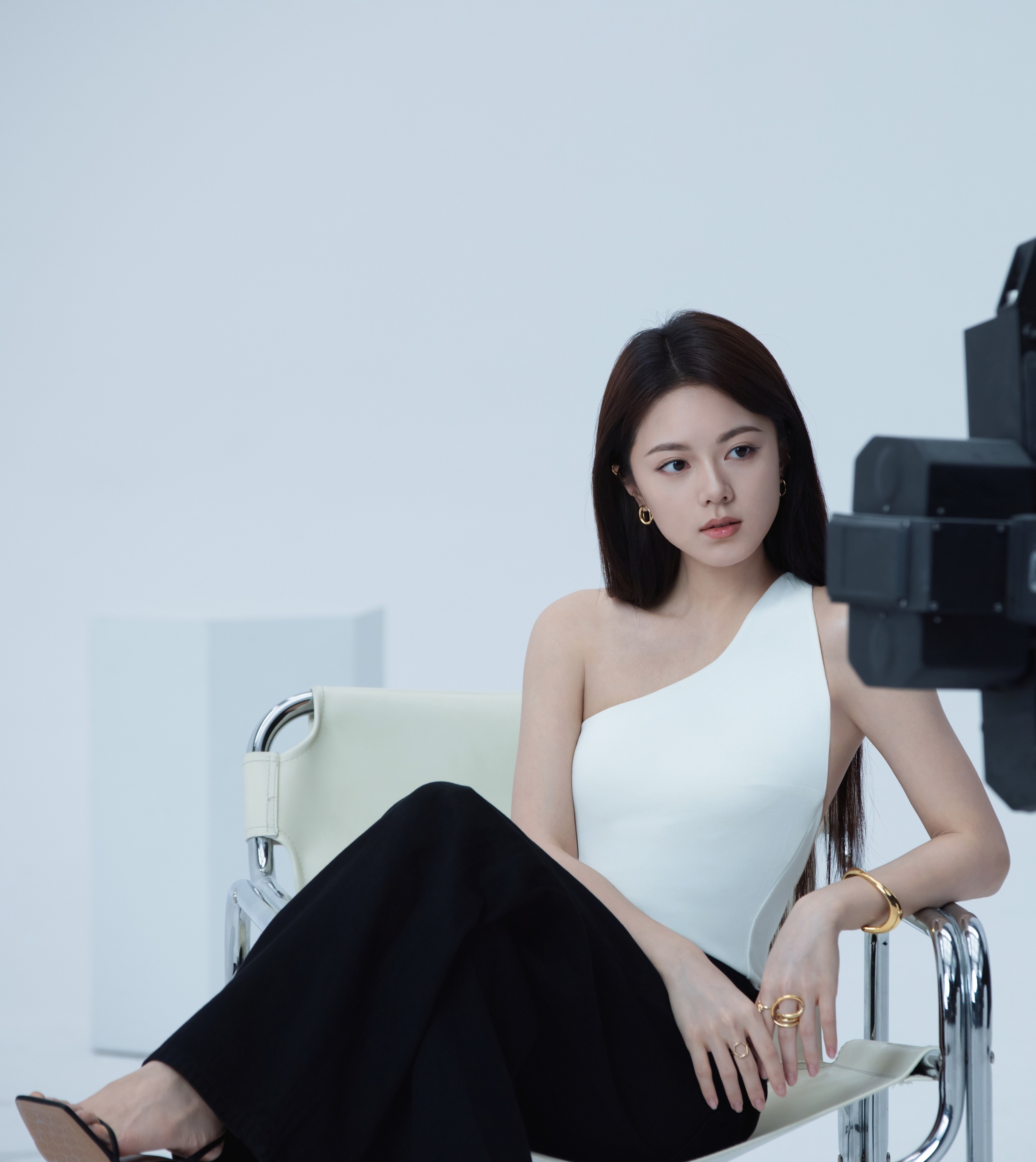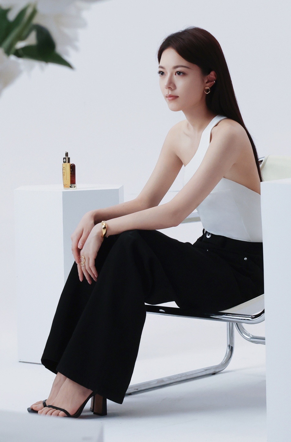 赵今麦镶钻围裙造型幂幂白色斜肩背心黑色西裤黑色一字带高跟鞋
