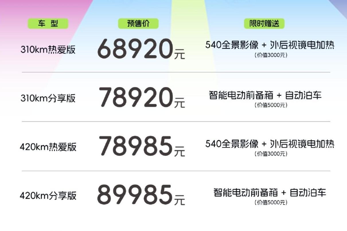 3月10日,奇瑞QQ3 EV正式开启预售。新车定位为纯电小型车,共推出4款车型,预售价区间为 6.892万至8.9985万元。 奇瑞QQ3 EV提供 310km 和 420km(CLTC工况)两种续航版本,电量从 30% 充至 80% 仅需不到 16.5 分钟,并支持最高 6.6kW 的对外放电功能。 奇瑞QQ3 EV采用同级少见的后置后驱布局与后多连杆独立悬架,最小转弯半径仅 5.2m。驱动电机最大功率分别为 58kW 和 90kW。 智能化方面,搭载猎鹰 500 智能驾驶辅助系统,支持了涵盖超车变道、上下匝道的高速 NOA 功能,以及 100+ 场景的自动泊车。 空间部分,奇瑞QQ3 EV轴距达 2700mm,拥有 70L 智能前备厢与最高可拓展至 1450L 的后备厢。座舱内标配高通骁龙 8155 芯片,配备 15.6 英寸 2.5K 中控屏与 Carmind 智能体,前排座椅还带有通风与加热功能。【来自懂车帝车友圈】