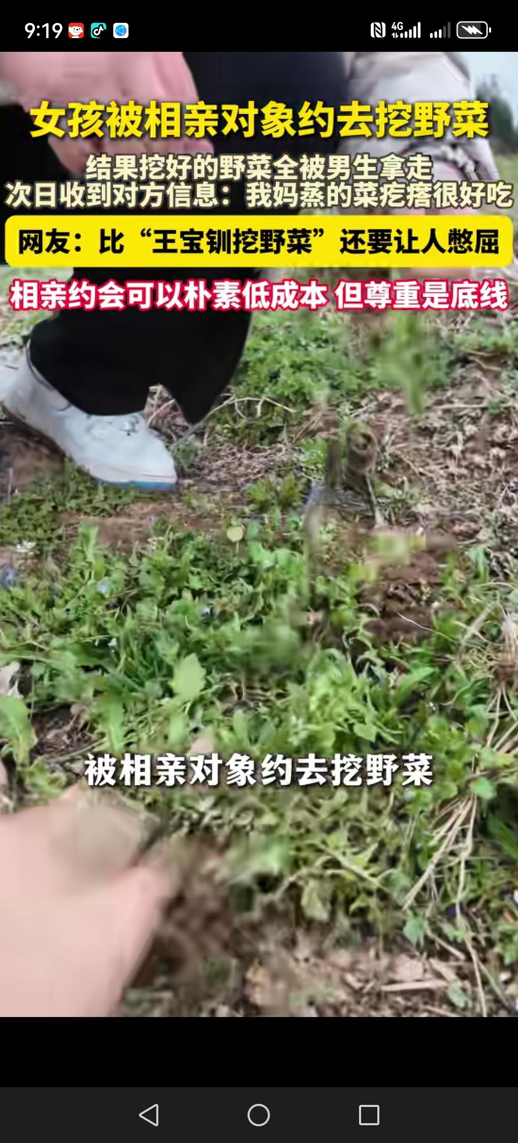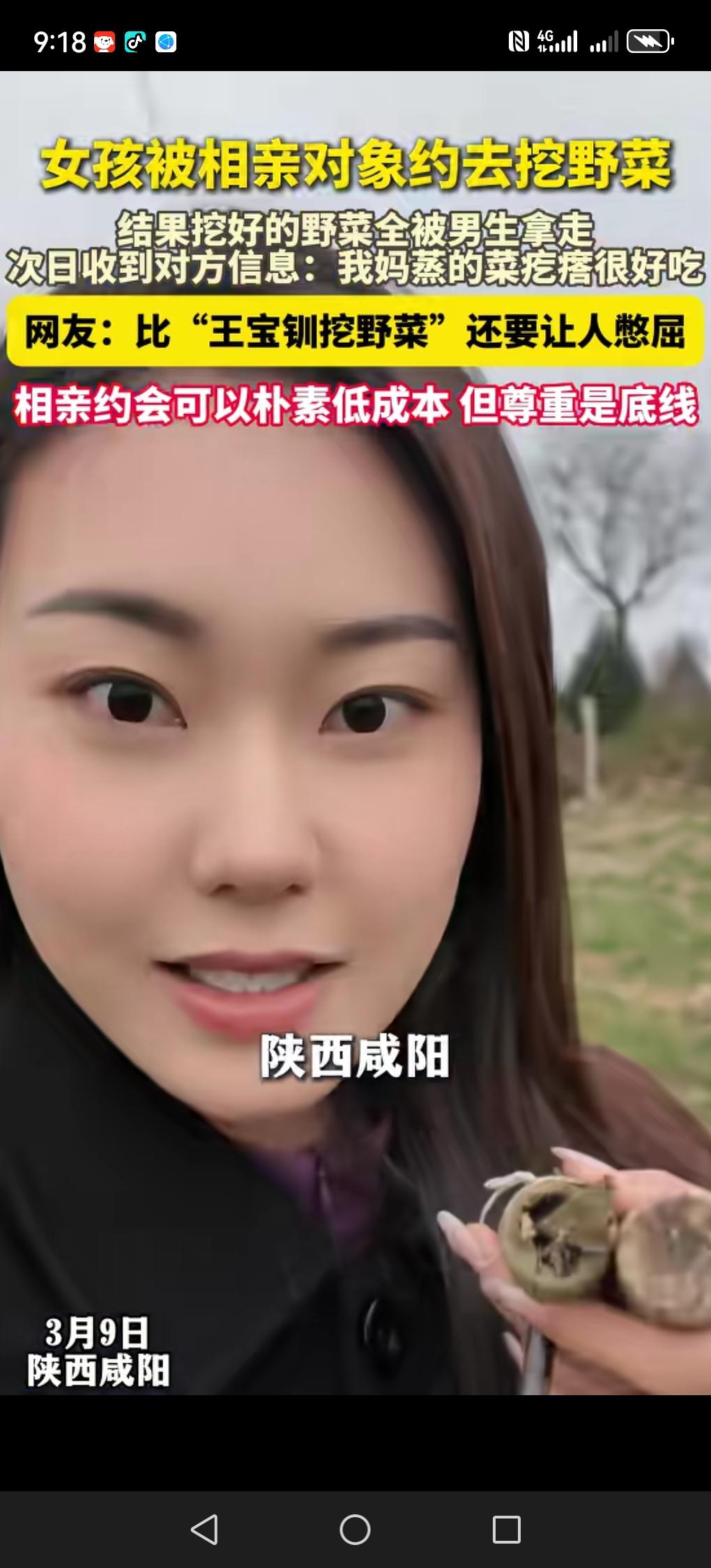 刚才看到一条新闻, 王宝钏都得掉到第二了。 陕西咸阳一对小年轻相亲, 男孩约女孩去挖野菜, 做野菜锅盔。 说要带她去体验最接地气的约会。 结果男孩将挖好的野菜全部给带走了,一点也没留给女孩。女孩还以为男孩会给她送点野菜疙瘩,结果第2天,男孩只给她发了张图片,说我妈蒸的菜疙瘩很好吃。 现在新闻一出,估计男孩也不敢出门了,不然得被人骂死。说实话,虽然我也是男的,但遇到这种男性,我只想说赶快跑,别回头。(文章和图片信息来源:美丽浙江)陕西相亲记 相亲 相亲交友