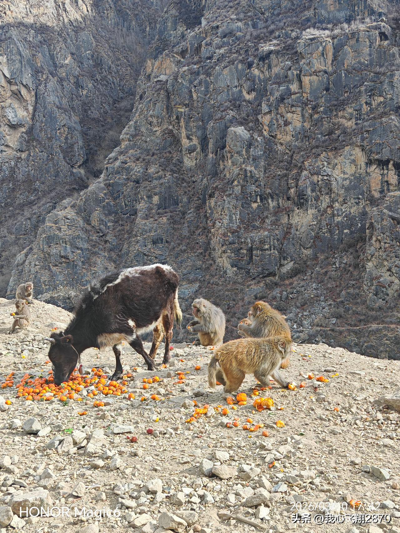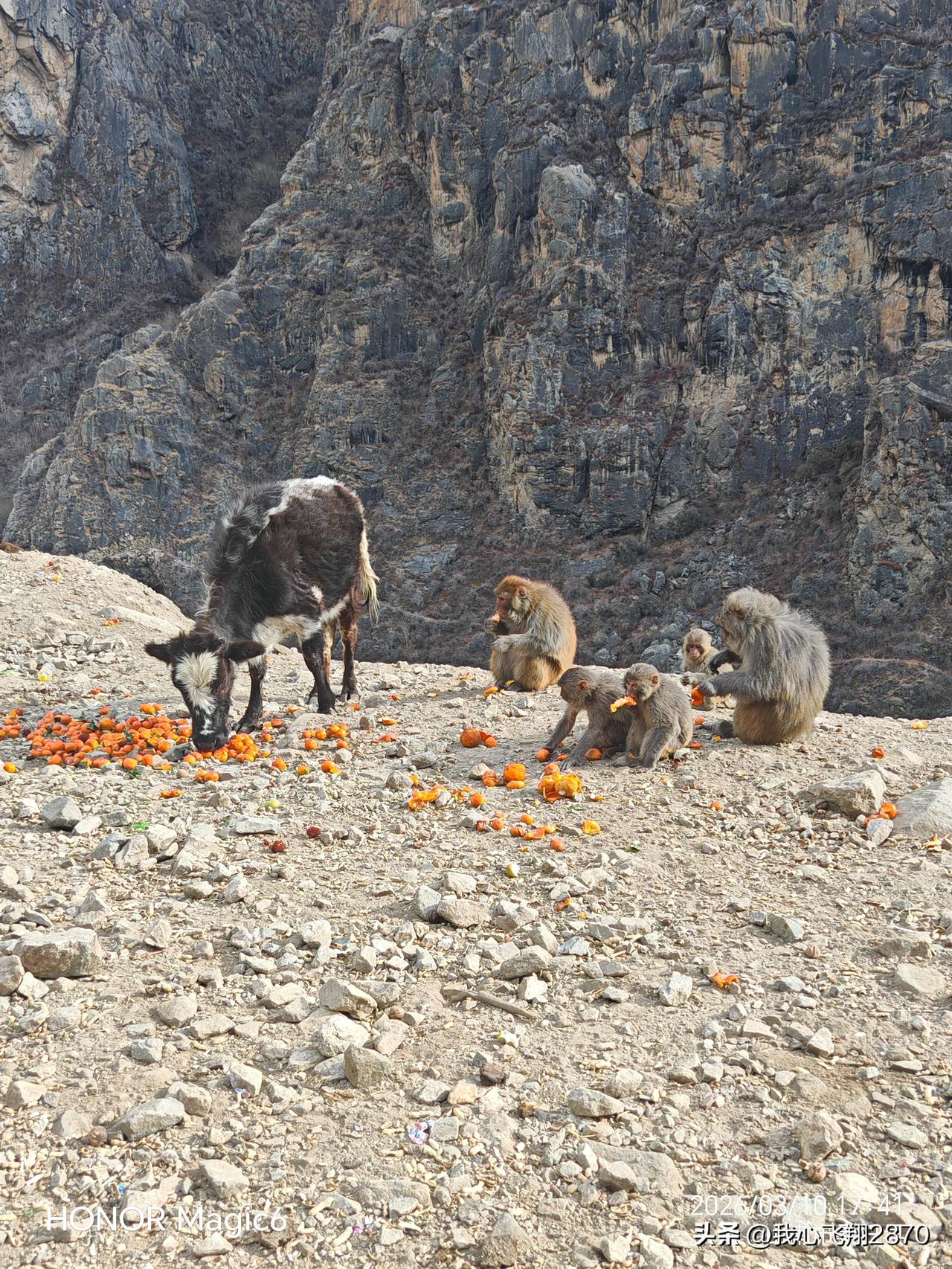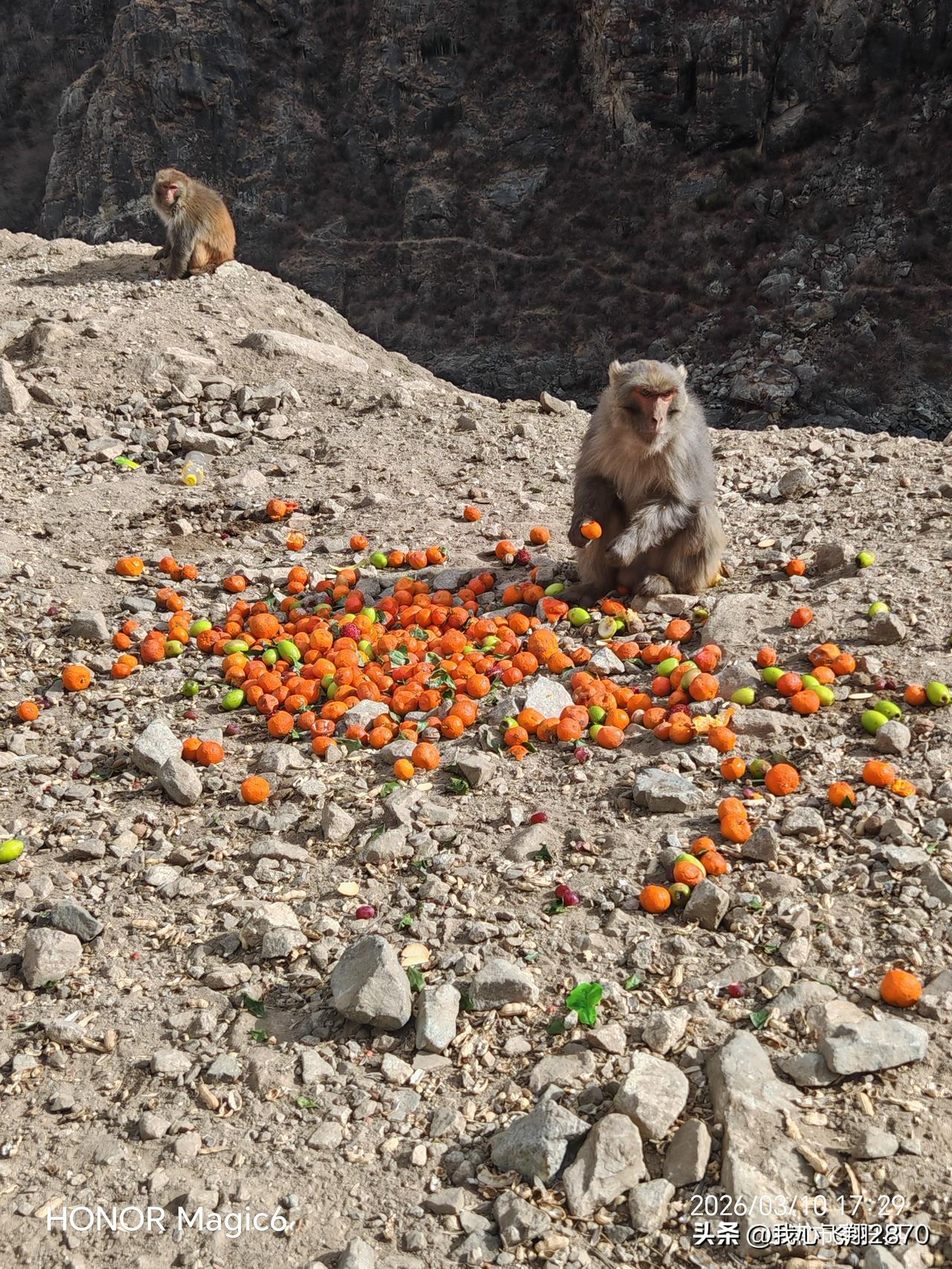 今天我在从林芝前往山南的路上,途经雅鲁藏布江达古峡谷时,瞧见一辆车停在路边。车主从车上搬下一箱水果,大多是橘子,还有些奶枣,接着就把这些水果倒在了紧挨着达古峡谷的路边。眨眼间,几十只猴子迅速聚拢过来,尽情享受美食,一头小牛犊也混在其中争抢着吃。 我上前打听,了解到这位车主是当地藏民,名叫巴路,是西藏朗县左嘎村的村民。他跟我说,自己常常会买些水果来投喂野生动物。要晓得,西藏多数地方不产水果,水果本就稀少,可仍有像巴路这样的爱心人士专门买水果投喂野生动物。在此,向所有心怀爱心、保护野生动物的人致敬! 说话间,巴路打开汽车后备箱,里面居然还有整整两箱水果。