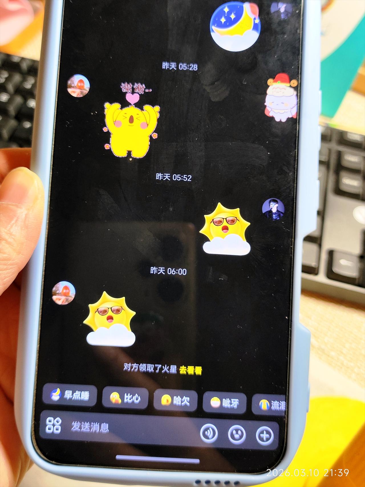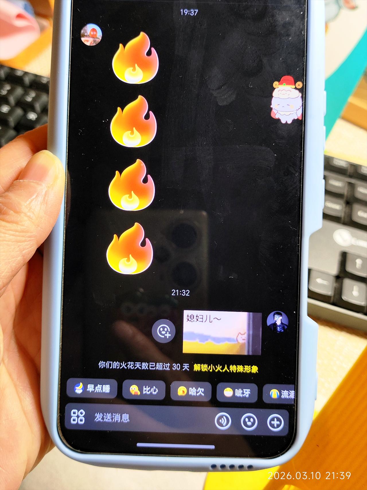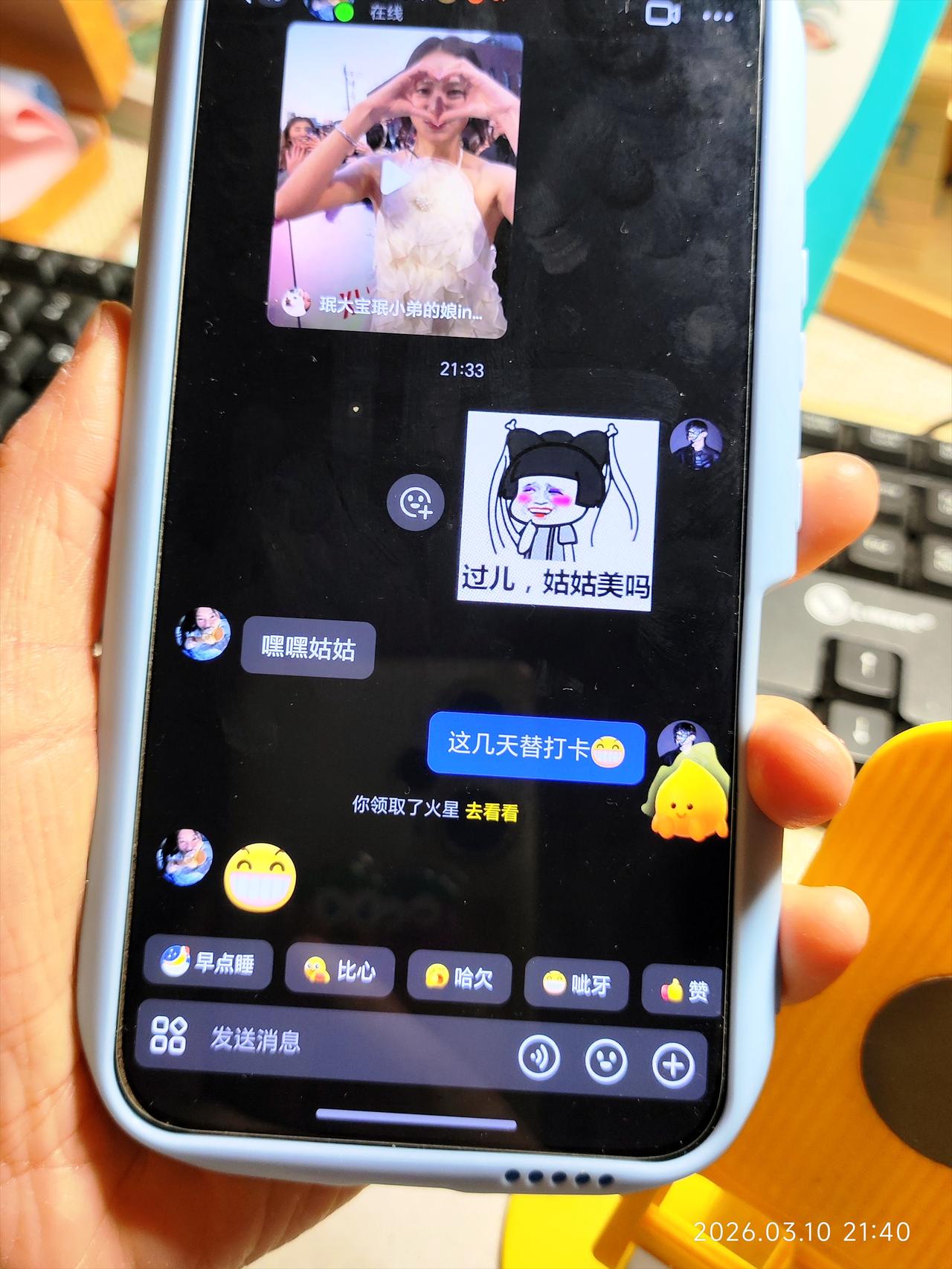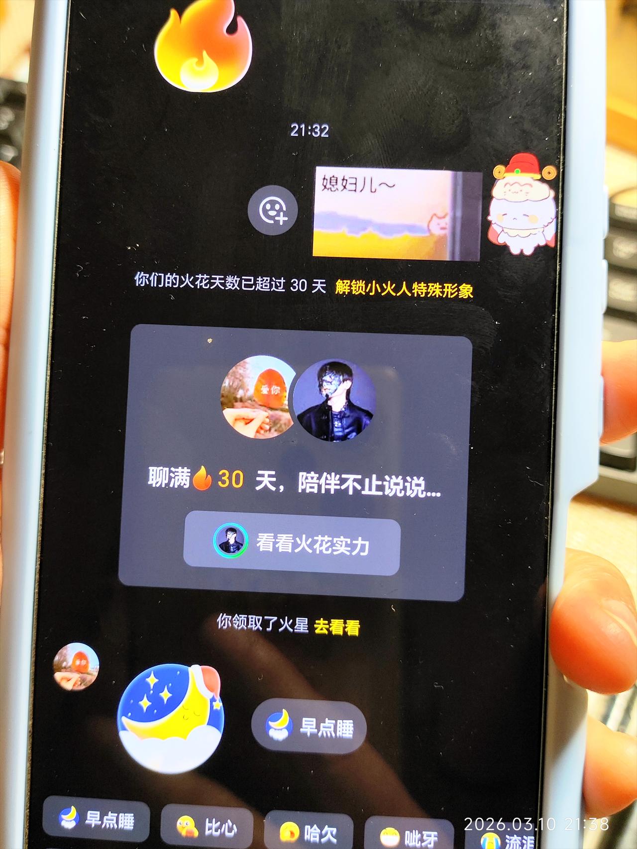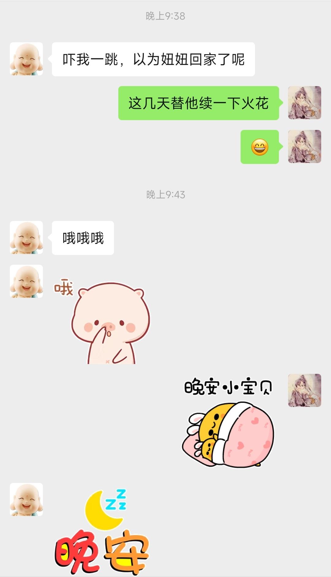 女儿去上学了,把手机交给妈妈抖音替她打卡。 晚上了,想睡觉,突然想起来一件事。 还没给闺女抖音打卡呢。 她上学住宿,之前让我给她游戏每天签到。 这一次她去学校前,又给我安排了个事,每天打开抖音,帮她续一下火花。 她在家的时候每天和爸爸,还有舅舅家的二姐,天天在抖音上续火花。 我也不知道这是干啥用的,她安排了咱就干呗。 我怕老公不知道是我给他发的,特地发的媳妇来了。 他还是被吓了一跳,以为女儿从学校回来玩手机了。 女儿跟舅舅家的二姐关系特别好。 二姐在上大学,女儿周六日回家拿手机,她们经常聊天。 我也怕二姐不知道我是谁,告诉她姑姑来了。 我就每天替女儿发个表情,打个卡吧。