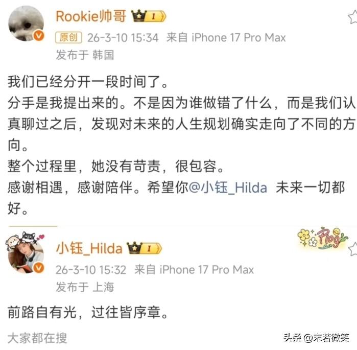 怪可惜的,Rookie和小钰相恋9年,今天官宣已经分手一段时间了。肉鸡说“两个人都没做错什么,未来人生规划不同”,所以选择了分手。 Rookie大概率以后会回韩国发展,而小钰在国内有自己的事业,如果两人结婚,肯定就是异地,不利于婚姻。 分手对他们来说应该是最好的选择了吧,互不耽误!两个人都有各自的人生追求,没必要谁为谁妥协,强扭的瓜不甜!