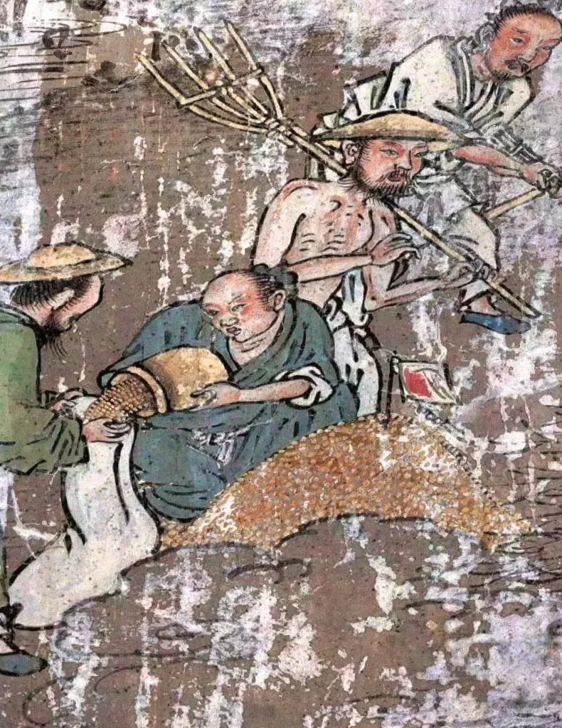稷益庙壁画是“ 墙上的农业史诗”。其中西壁《稼穑图》细绘春日烧荒、扶犁播种、挑担送肥的农耕场面。