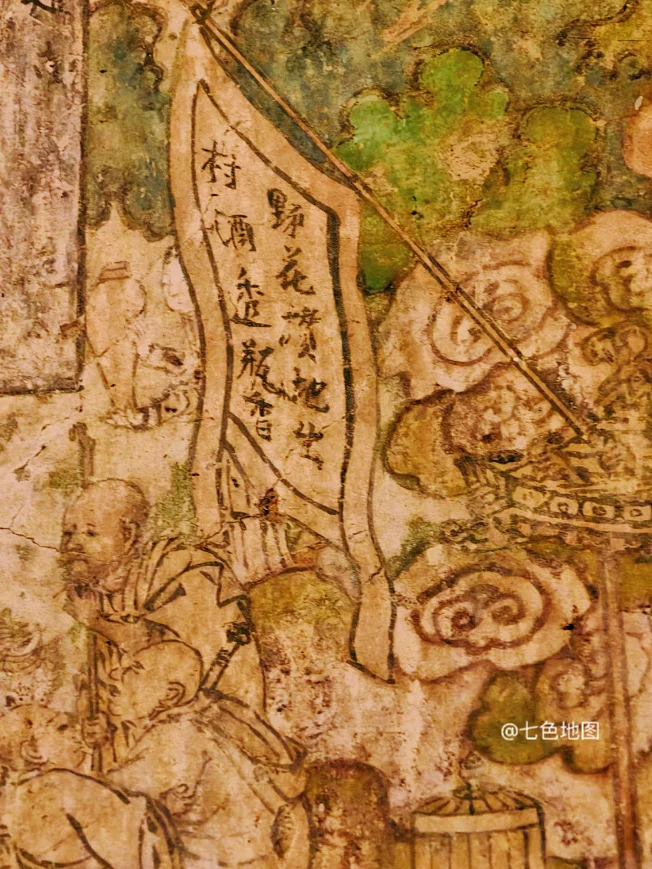 壁画以宋金北方春日市井/郊野实景为底色,有“金代清明上河图”之称。名句“野花攒地出,村酒透瓶香”直接题于西壁酒楼,是春游主题的点睛之笔。