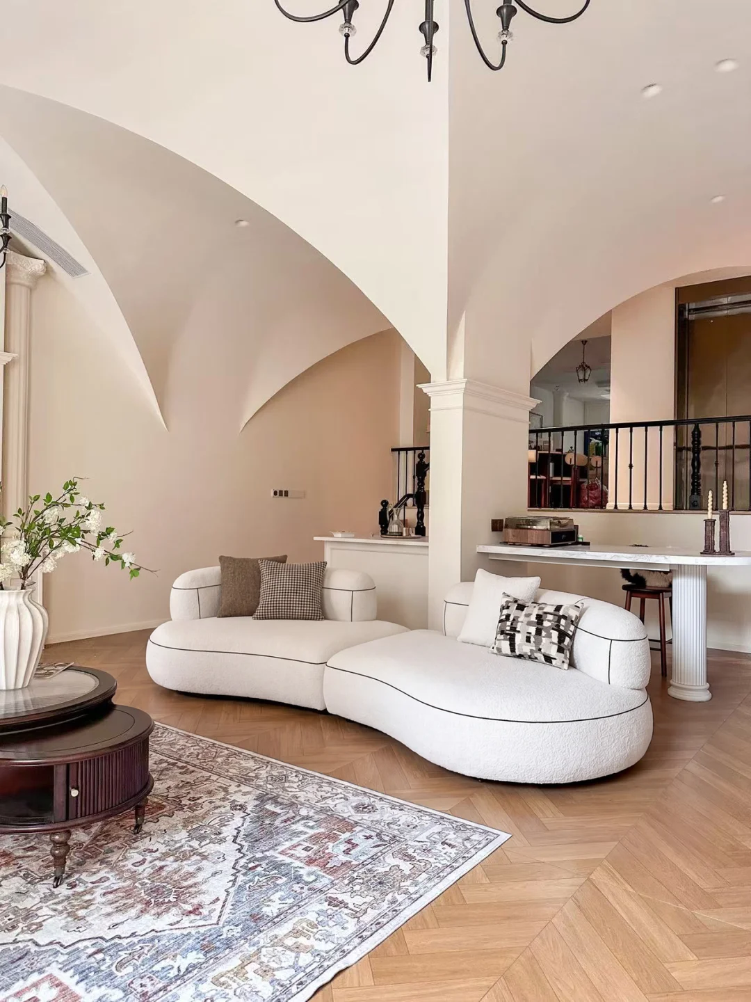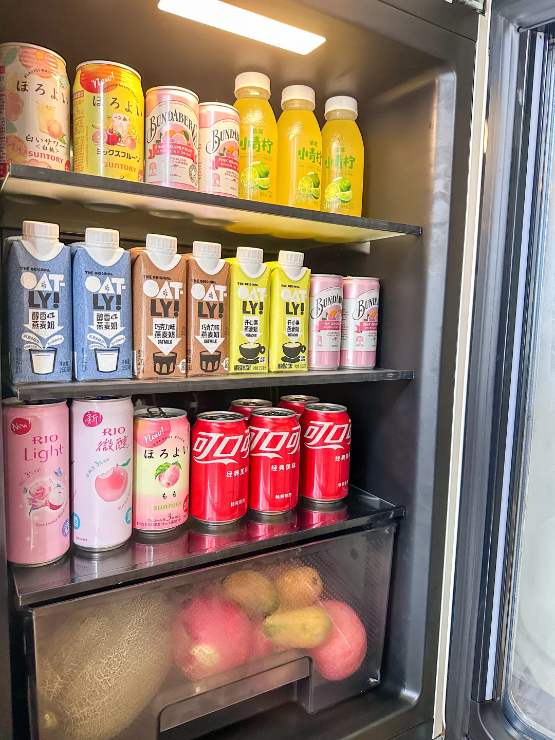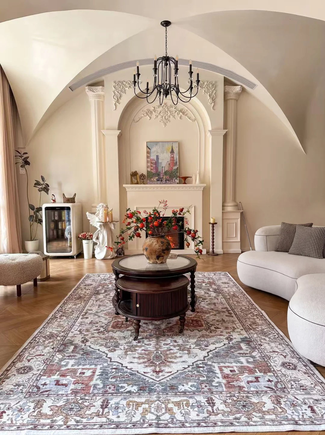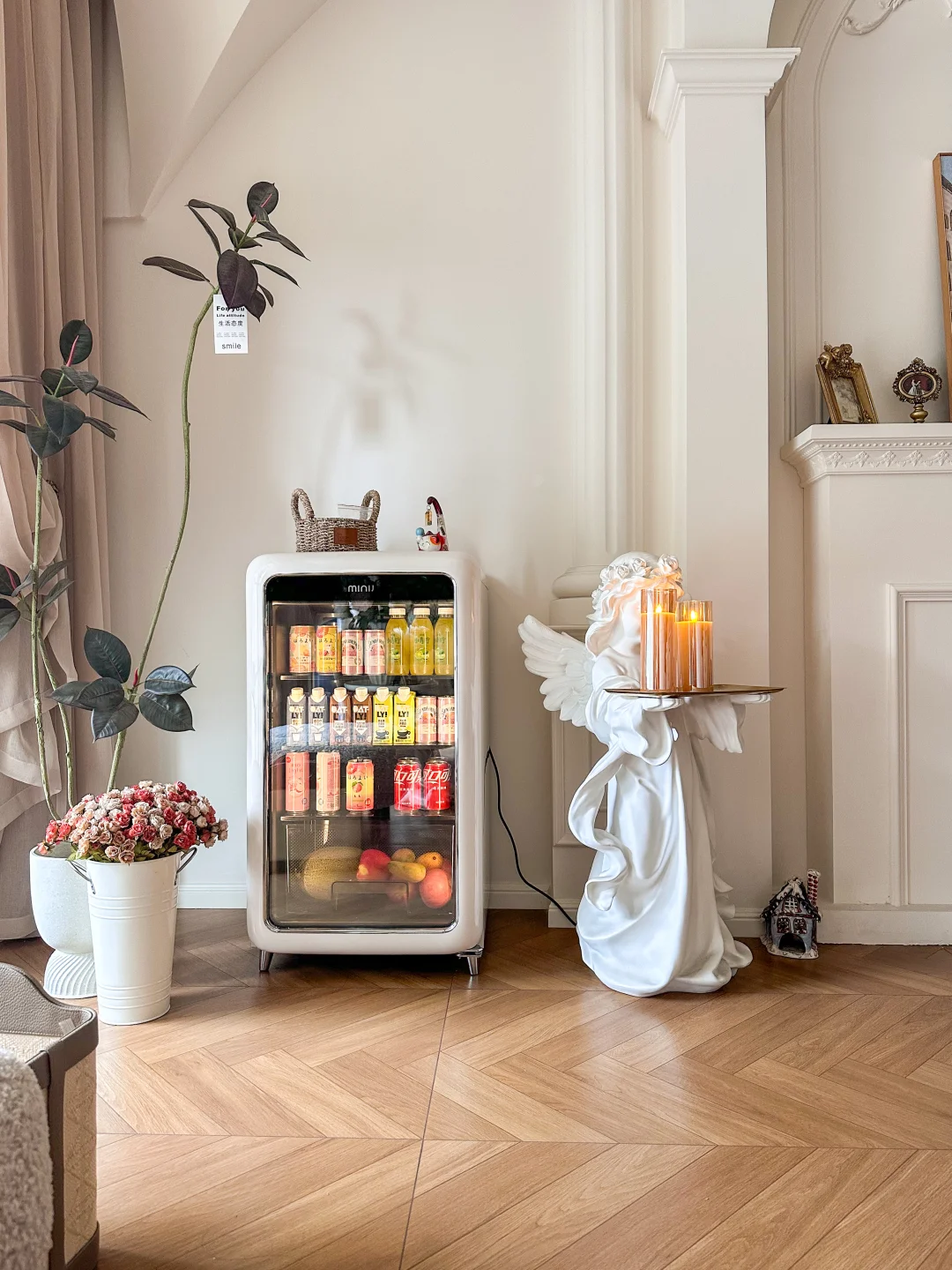 客厅的松弛感,全靠这个角落拿捏。 在壁炉旁的留白处摆上它,奶乎乎的质感刚好呼应沙发,圆润线条和客厅的弧形穹顶、拱门完美契合,不突兀反倒像定制的软装摆件。 再也不用为了拿瓶冰气泡水、取串鲜葡萄跑厨房,宅在沙发上追剧,伸手就能解锁冰镇快乐。分区收纳超贴心,上层放水果鲜切,下层囤满爱喝的饮品,玻璃门通透又防尘,阳光洒下来,连里面的饮品都成了客厅的一道风景。 容量不大却胜在精致,刚好满足日常小酌和水果保鲜,把细碎的美好,都藏在客厅的这方小天地里。