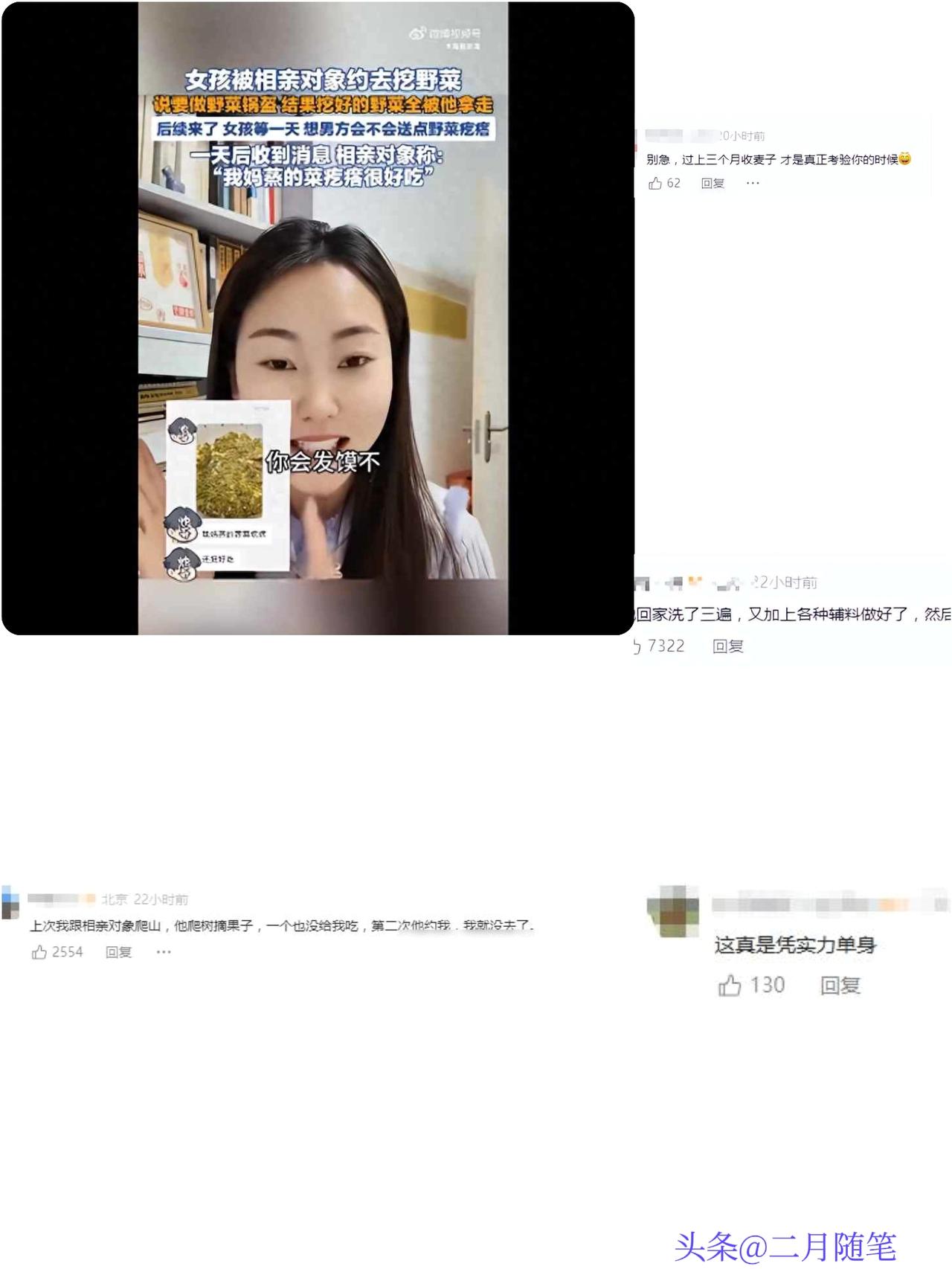 陕西咸阳一女孩被相亲对象约去挖野菜, 结果挖好的野菜全被男生拿走。还说... 姑娘不辞辛苦挖了满满两大袋野菜, 可男方却没给她分哪怕一片菜叶, 直接把野菜拎回家蒸成了菜疙瘩, 还发消息炫耀妈妈手艺高超。 网友调侃,这哪儿是什么约会, 分明是找了个免费劳动力。 类似的情况并不少见,有人被喊去摘野果,白忙一场;有人在烧烤聚会时,只能负责刷碗。 如今,部分相亲者把“抠门”粉饰成实在,认为一起吃苦就是培养感情,实则是自己坐享其成,让对方辛苦付出。 调查表明,近四成95后女生在相亲时碰到过对方只索取不奉献的情况,且这一比例还在上升。 并非姑娘们变得爱计较,而是有些人以穷为托词,以节省为借口,将别人的真心当作免费的劳动力。 小事积累多了,也会让人身心疲惫。 其实谁也不差那一把野菜,差的是最基本的尊重,是你满心期待去约会,最后却被当成工具人的心寒。 这种连一片菜叶都舍不得分你的人,就算他妈手艺再好,姑娘也得躲远点! 人品不行,再“接地气”都是垃圾。 你们相亲碰到过最抠、最奇葩的事是什么? 遇到这种白嫖式相亲,你会直接翻脸吗? 相亲奇葩事 咸阳相亲 挖野菜式相亲 当代相亲图鉴 远离抠门男农村女人相亲 陕西相亲记