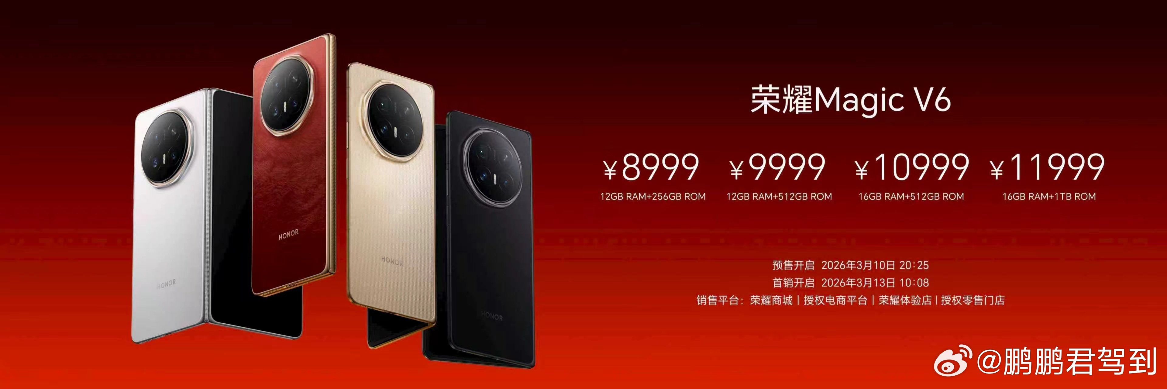 荣耀Magic V6售价8999元起!不仅是"冠军之选" ,更在轻薄、续航、屏幕、可靠、性能、影像、AI生产力等均是“冠军”表现,“折叠大满贯”实至名归!荣耀Magic V6 共提供12GB+256GB、12GB+512GB、16GB+512GB、16GB+1TB四个版本,售价8999元起。新品已即刻开启预售,并将于3月13日上午10:08,在荣耀商城、各大授权电商平台、荣耀体验店、授权零售门店正式开售。首销购机,还将获赠价值999元尊享服务。