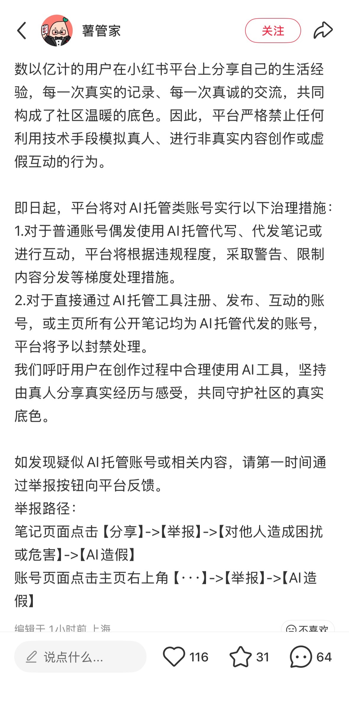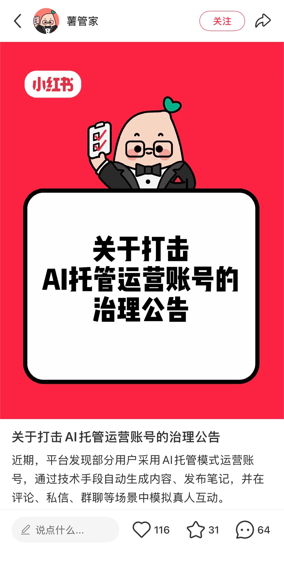 你的龙虾还没有学会在小红书上发帖,小红书已经重拳出击了,打击AI托管账号。
