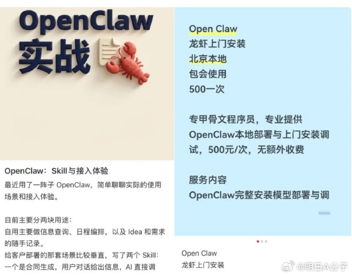 大厂门口,排队免费装龙虾。上至60岁阿姨,下至4年级小学生,都对本地部署龙虾,产生了强烈的兴趣,而在美团上,上门装龙虾,也已经变成了程序员们的又一个副业。最高报价500元,不过由于后来程序员们太过于踊跃,价格已经被卷下来了,有的报价已经不足100元。所以服务业永远不缺机会,群众们有不方便的地方,就有创业的可能。就看你有没有发现的眼光。