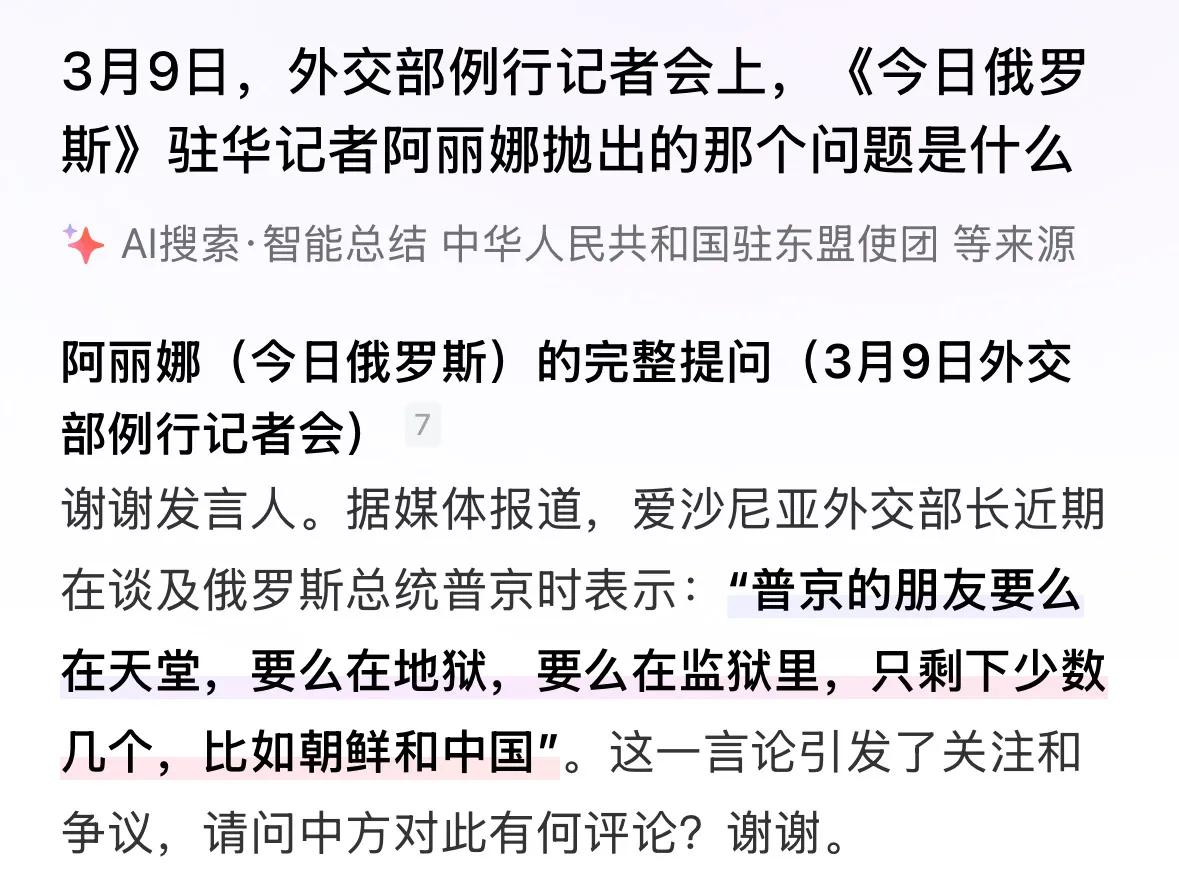 看到《今日俄罗斯》驻华记者阿丽娜的提问,第一反应是假新闻,一查居然是真的,而且网上并没有屏蔽。 没太明白,作为一个友好媒体、标榜自己已经是95%中国人的记者,阿丽娜竟问出了这么坏的问题,关键是我们还允许她这么问! 这说明了我们的自信。