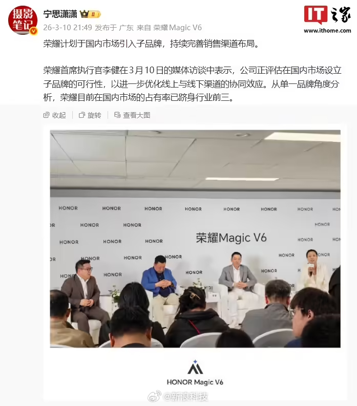 【荣耀CEO称正评估设立子品牌荣耀CEO称今年计划销量8500万台】据博主分享,荣耀 CEO 李健在发布会后接受媒体采访时表示,公司正评估在国内市场设立子品牌的可行性,以进一步优化线上与线下渠道的协同效应。从单一品牌角度分析,荣耀目前在国内市场的占有率已跻身行业前三。
