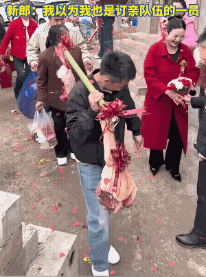 男生到女方家定亲,紧张的头都不敢抬,敢不敢左右看,拿着鲜花结果错过了女友,女友提
