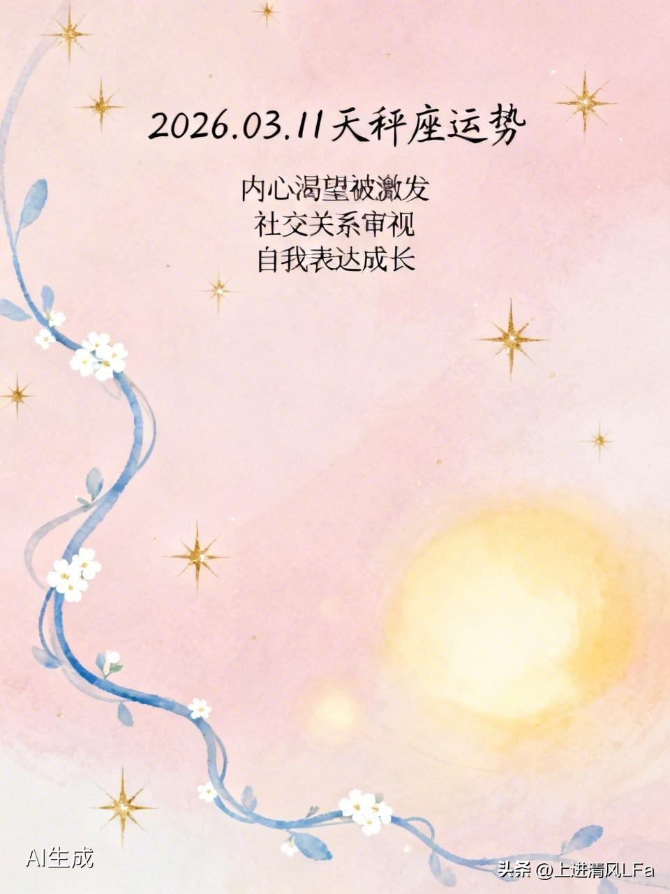 虽然没找到天秤座2026年3月11日具体运势,但从整体的星座氛围能推测一二。2026年3月11日前后,星座运势强调内心渴望的力量。对于天秤座来说,这天或许内心渴望会被激发。在社交上,可能会像白羊座那样重新审视身边的关系,某些友谊会加深,而有些则会自然淡去。在自我表达上,或许会像金牛座一样,有小改变来反映内心成长。说不定会在这天与朋友坦诚交流新话题,点燃构建未来的联系,也可能做出尊重自身成长的可视变化,去超越自己以为能做到的极限。