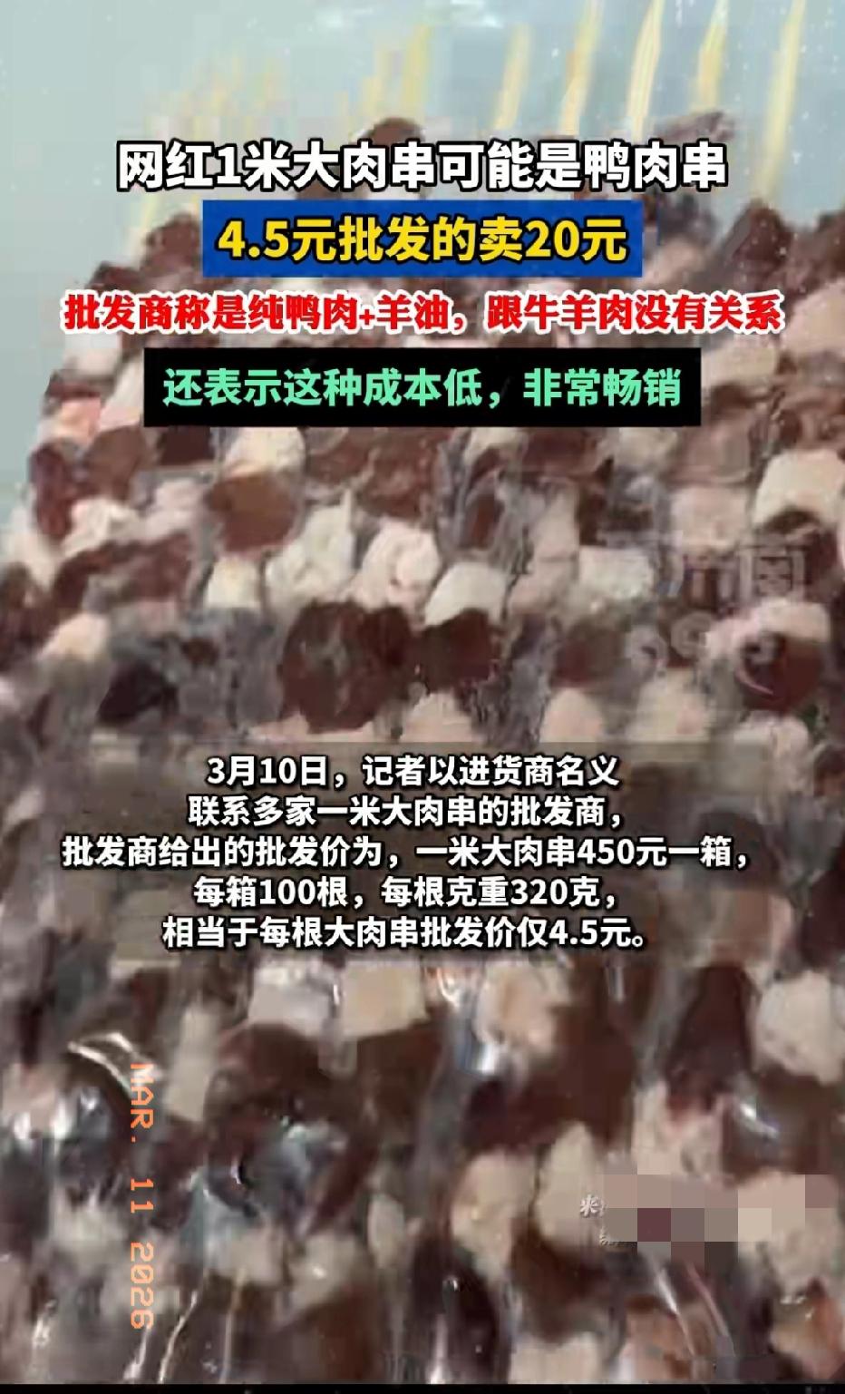 近日,网红“1米长大肉串”被曝可能是鸭肉串!批发价4.5元,卖到20元!商家直言