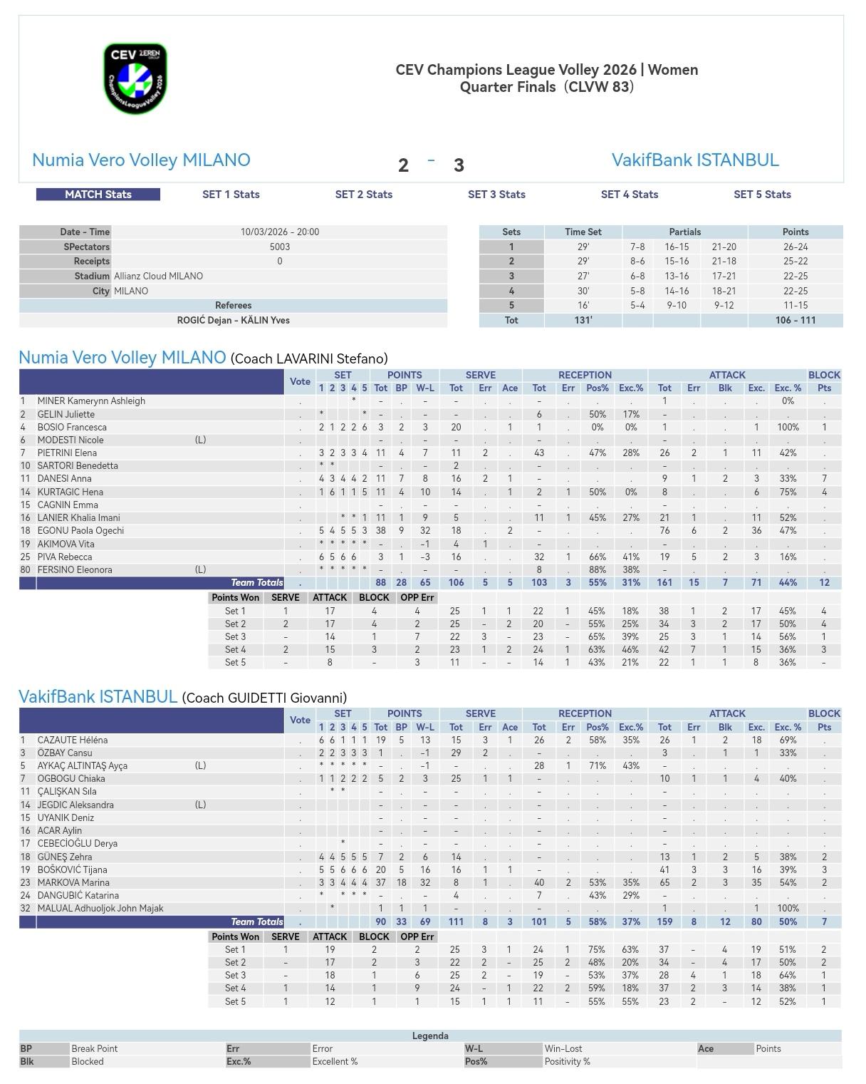 瓦基弗银行让二追三逆转米兰,欧冠四强赛抢得先机 2025-2026女排欧冠1/4决赛首回合,米兰在主场先下两局的情况下被瓦基弗连扳三局,2-3不敌对手惨遭逆转,比分26-24, 25-22, 22-25, 22-25, 11-15。 埃格努头两局简直如入无人之境,表现堪称统治级,两局结束即斩获24分,无奈后程体力不支,进攻效率明显下降,即便如此,全场也砍下38分,当之无愧成为得分王。而前半程稍显落寞的马尔科娃则逐步发力,最终拿到37分荣膺MVP。博什科维奇拿到20分表现中规中矩,拿到19分的法国一姐卡绍特则表现相当惊艳,一直高效率稳定输出,而且多次乱球、关键球下分,成为瓦基弗转败为胜的又一功臣。 米兰: 埃格努76扣36中6失2被拦、0拦2发38分 库尔塔吉奇8扣6中0失0被拦、4拦1发11分 拉尼尔21扣11中1失0被拦、0拦0发11分 皮特里尼26扣11中2失1被拦、0拦0发11分 达内西9扣3中1失2被拦、7拦1发11分 博西奥1扣1中0失0被拦、1拦1发3分 皮瓦19扣3中5失2被拦、0拦0发3分 麦娜1扣0中0失0被拦、0拦0发0分 瓦基弗银行: 马尔科娃65扣35中2失3被拦、2拦0发37分 博什科维奇41扣16中3失3被拦、3拦1发20分 卡绍特26扣18中1失2被拦、0拦1发19分 居内什13扣5中1失2被拦、2拦0发7分 奥格博古10扣4中1失1被拦、0拦1发5分 马卢阿1扣1中0失0被拦、0拦0发1分 厄兹巴伊3扣1中0失1被拦、0拦0发1分 米兰-瓦基弗银行: 进攻得分:71-80 拦网得分:12-7 发球得分:5-3 对方送分:18-21 总得分:106-111 一传到位率:55%-58% 一传完美率:31%-37% 意甲欧冠