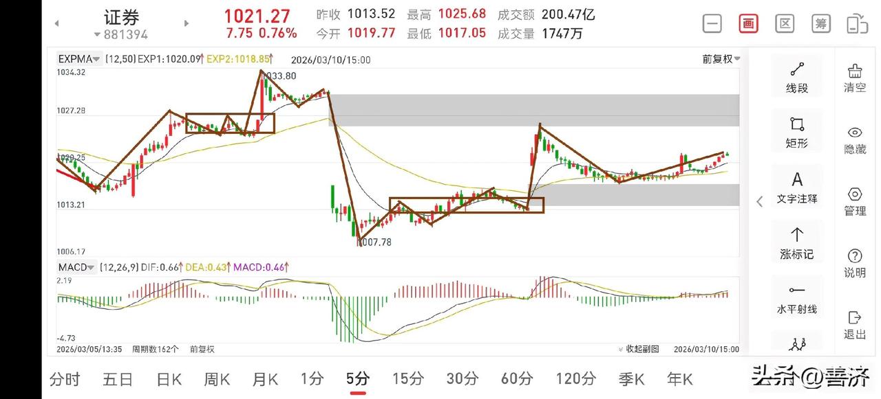 证券板块早盘策略(2026.3.11) 昨晚文章中的观点可能太保守了,这里修正一下,从30分钟图一上看,红圈处是一个强势背驰,尽管昨天形成了30分钟的二卖,但它回踩破新低的概率很小,这样的话,便反手形成了30分钟的二买,所以后面二天短线是可以看多的,而且大概率会拉出大阳线。 从5分钟图二上看,早盘预计会回补下方缺口,从而形成30分钟的二买,到时可考虑回补5成仓位,然后耐心等待上涨。至于何时退出,我也会做出友情提醒。天南地北大拜年 证券板块动态