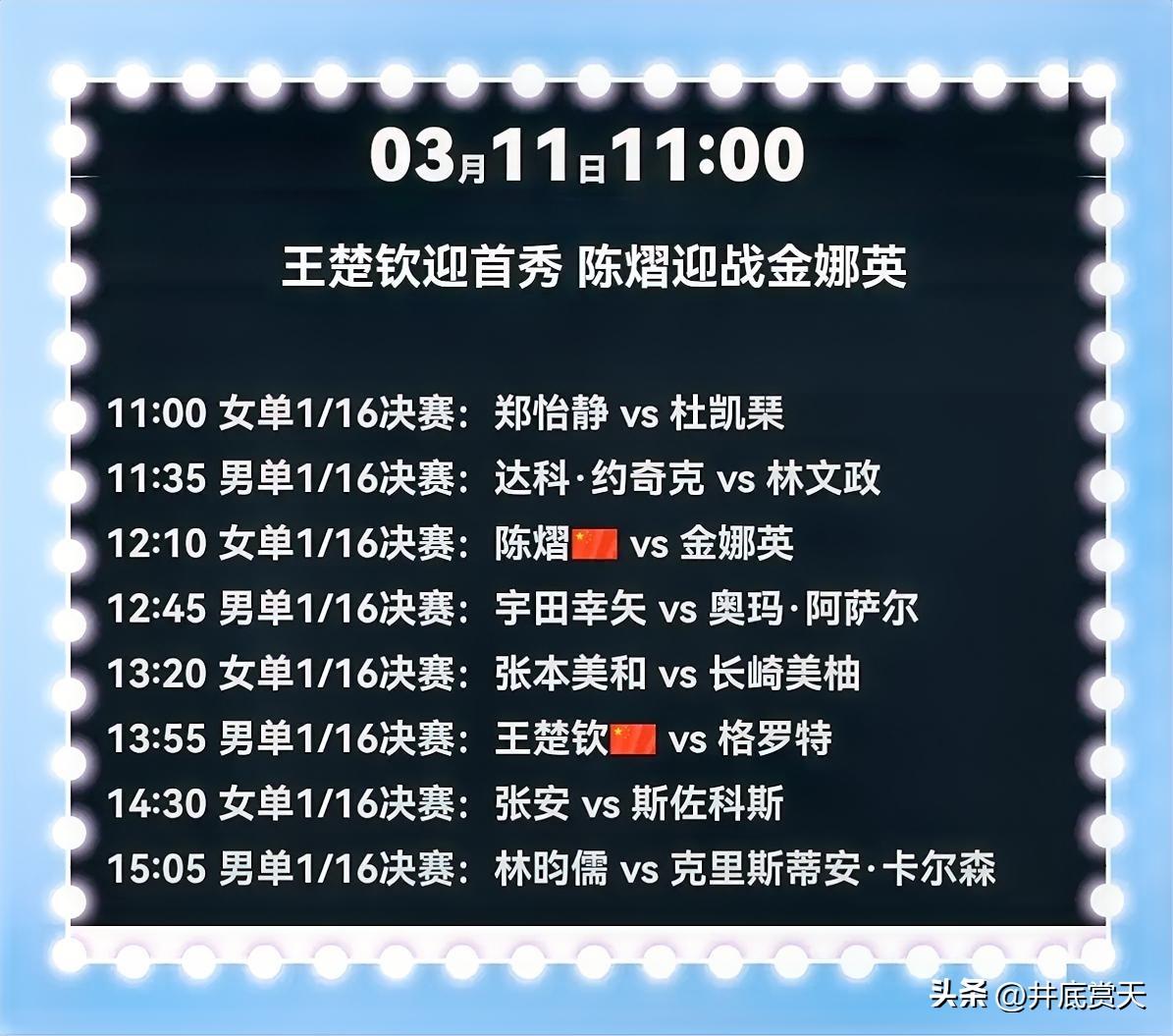 重庆冠军赛今日上午看点: 今天上午国乒两场焦点战:12:10陈熠vs金娜英,陈熠交手全胜,实力占优,有望稳赢。13:55王楚钦首秀,对阵丹麦格罗特,大头两战全胜,实力碾压,大概率3-0或3-1晋级。两场都很稳,国乒有望双杀过关。 给二位加油!