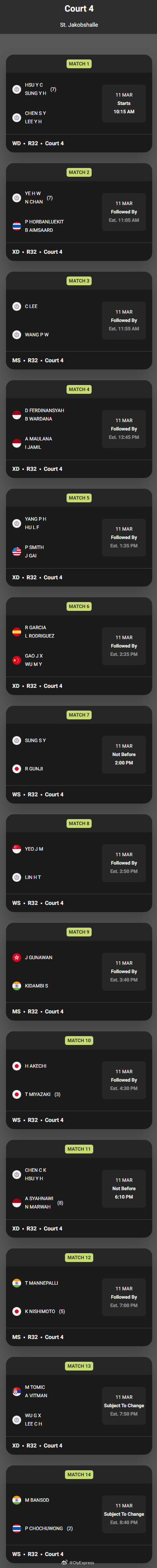 【瑞士羽毛球赛11日赛程对阵】2026年瑞士羽毛球公开赛羽联超级赛3月11日巴