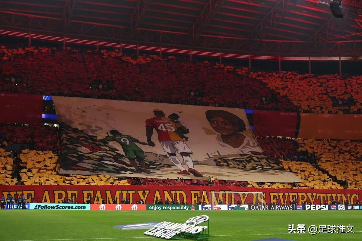 足球,从来都不止于足球! 加拉塔萨雷对阵利物浦的欧冠八分之一决赛首回合赛前,主场球迷为奥斯梅恩打造了巨型Tifo,让尼日利亚前锋泪洒现场。 Tifo画面是奥斯梅恩身着加拉塔萨雷 45 号球衣的形象,他怀抱着女儿,他手牵着着小时候的自己。 背景是他童年生活的拉各斯社区,而在画面右上方,一位带着温柔微笑的女性注视着他们,那正是奥斯梅恩已故的母亲。 Tifo下方写着:“WE ARE FAMILY AND FAMILY IS EVERYTHING”,我们是一家人,家人就是一切。Tifo瞬间击中了奥斯梅恩内心最柔软的地方。奥斯梅恩自幼丧母,他在成名后的多次采访中都提到,母亲的去世是他人生中最沉痛的打击。 本场比赛开场仅 7 分钟,奥斯梅恩就送出助攻,帮助队友勒米纳率先破门,帮助加拉塔萨雷最终以 1-0 在首回合占得先机。