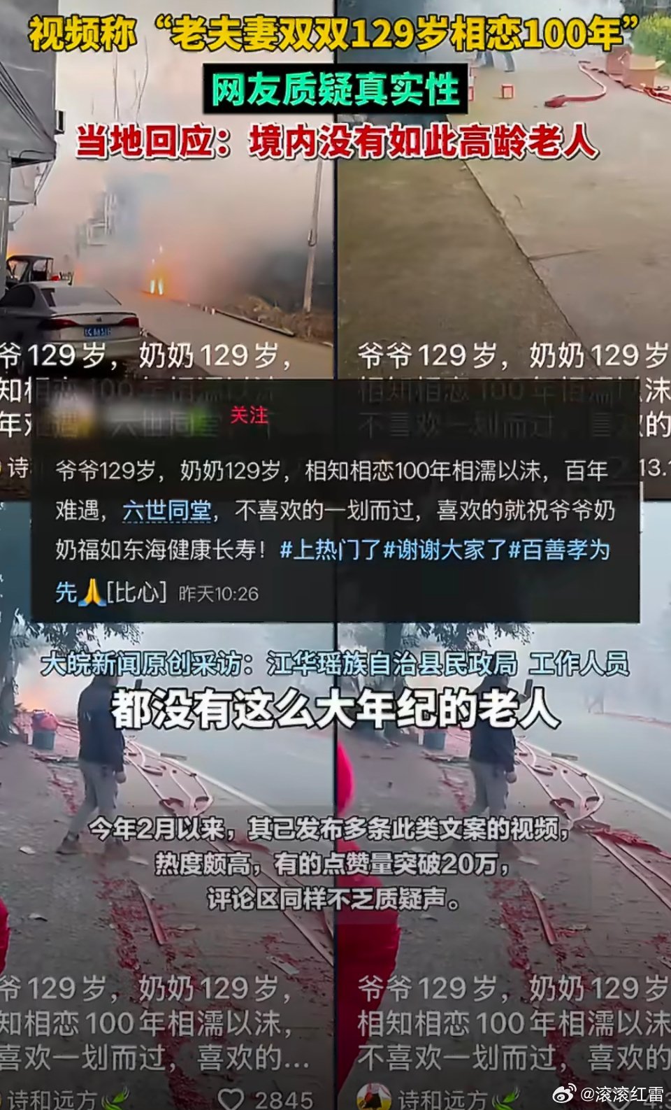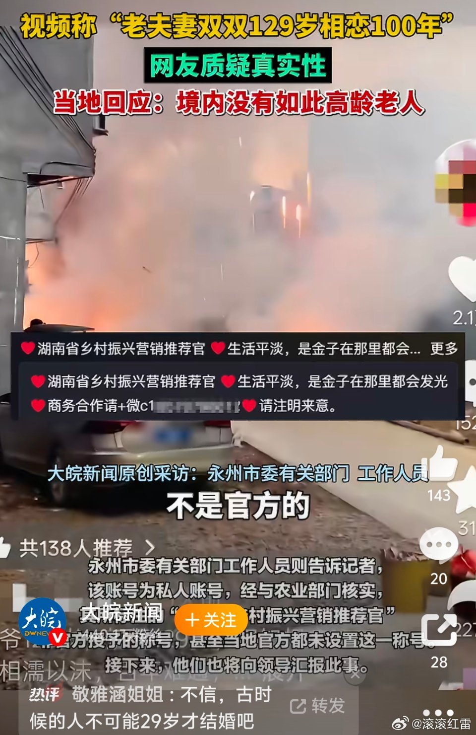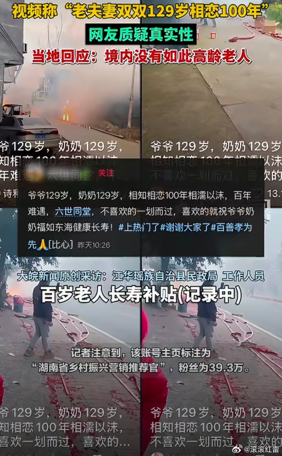 129岁高龄夫妻本就违背常识,视频不见老人出镜却挂着“乡村振兴推荐官”的虚假头衔引流,上百万点赞背后是对公众善意的消耗。当地民政部门及时辟谣,明确境内无此高龄老人,这份澄清很有必要。