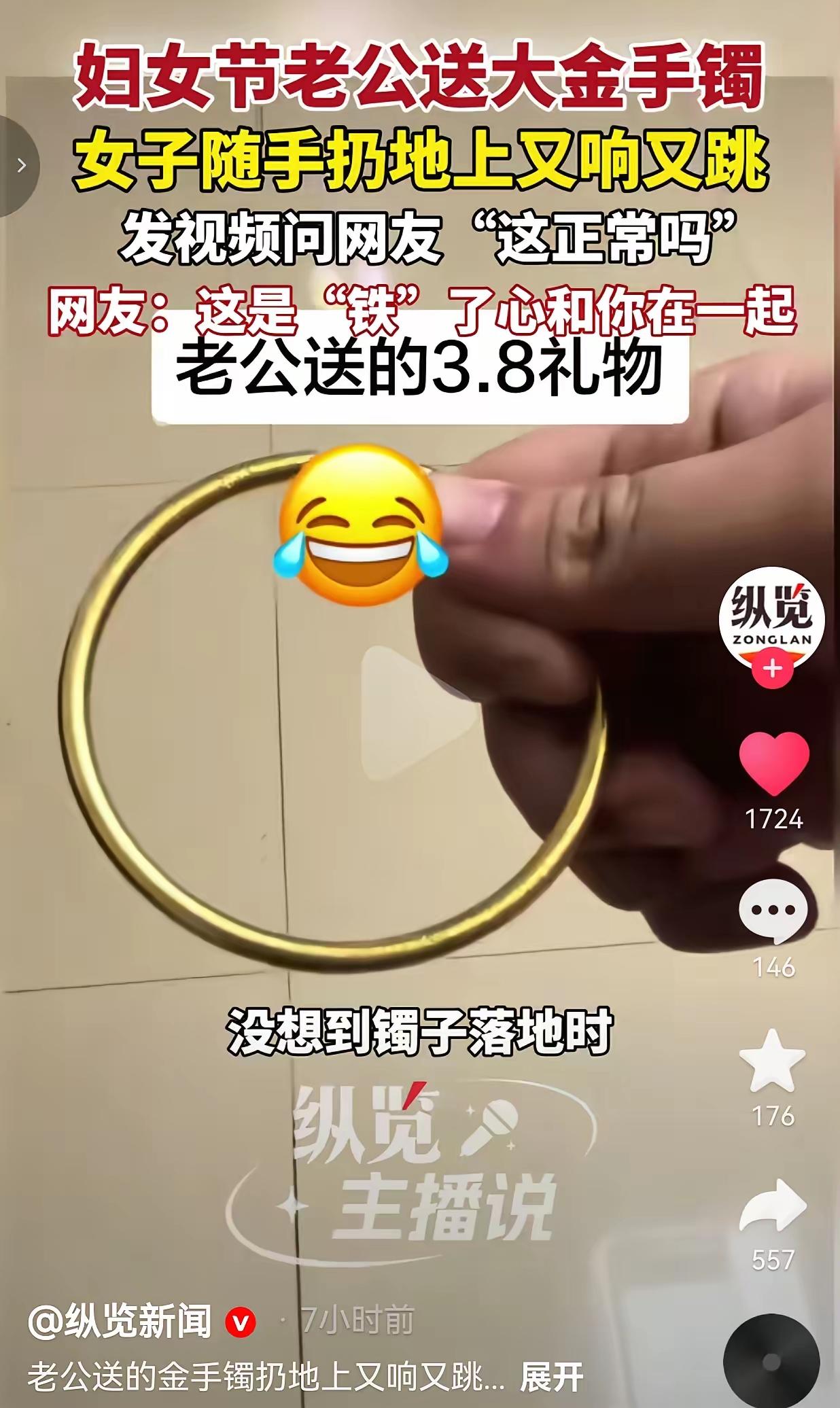 女子应该把老公送的玉镯子扔到地上检验一下,因为玉非常容易摔断,而塑料的就不容易断,只要猛力砸到地上看见不断肯定是假。当然这是玩笑话,现在很多金镯子中间是镂空的,有的还有花纹,如果扔到地上很容易摔坏,不知女子把老公送了金镯子扔在地上是什么心理?如果真想检验真假,应该到正规检验机构,而不是这样摔在地上,这样检验是为了搞笑。