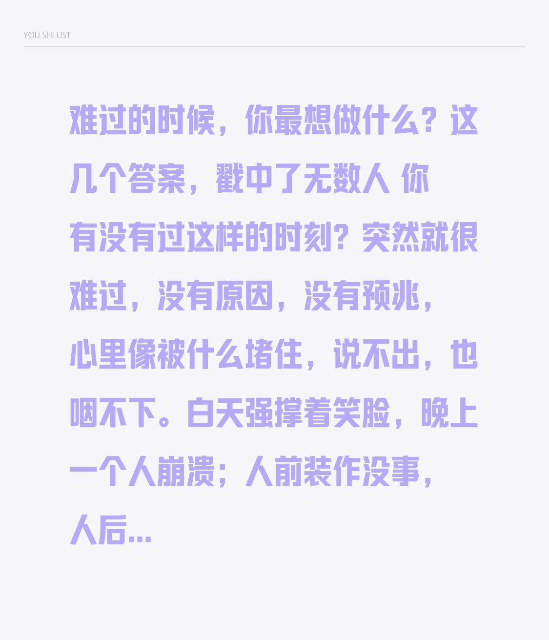 难过的时候,你最想做什么?这几个答案,戳中了无数人 你有没有过这样的时刻? 突然就很难过,没有原因,没有预兆,心里像被什么堵住,说不出,也咽不下。 白天强撑着笑脸,晚上一个人崩溃;人前装作没事,人后偷偷掉泪。 难过的时候,你最想做什么? 有人说,想一个人待着,关掉手机,拉上窗帘,什么都不想,什么都不做,就安安静静地放空。 有人说,想大哭一场,把所有委屈、压力、不甘,全都哭出来,哭完了,好像就能轻松一点。 有人说,想大吃一顿,用甜的、辣的、香的填满胃,好像胃暖了,心就不那么冷了。 有人说,想出去走走,吹吹风,看看天,走很远的路,让疲惫把难过冲淡。 还有人说,什么都不想做,就想找个人抱抱,什么都不用说,只要安安静静陪着就好。 我们总以为,难过是软弱,是矫情,是不够坚强。 我们习惯了硬扛,习惯了假装没事,习惯了把情绪藏起来,怕被人看见,怕被人笑话。 可你知道吗? 难过,从来都不是错。 转折点就在这里—— 真正的坚强,不是从不难过,而是难过了,也允许自己难过。 允许自己崩溃,允许自己脆弱,允许自己有撑不住的时候。 你不必一直阳光,不必一直乐观,不必一直懂事。 你可以累,可以痛,可以哭,可以暂时停下来。 难过的时候,不用逼自己立刻好起来,不用假装没事。 你可以发呆,可以沉默,可以流泪,可以任性。 情绪没有对错,感受都是真的。 难过,是生活给你的信号: 你累了,该歇歇了; 你痛了,该抱抱自己了; 你扛太久了,该放一放了。 人生不是一直向前冲,偶尔停下来,不是放弃,是为了更好地出发。 难过不是终点,是情绪的出口,是自愈的过程。 愿你难过时,有人懂; 愿你崩溃时,有人陪; 愿你不用硬扛,不用假装, 愿你被世界温柔以待,也被自己好好善待。 难过的时候,你最想做什么? 评论区告诉我,我在这里听你说。