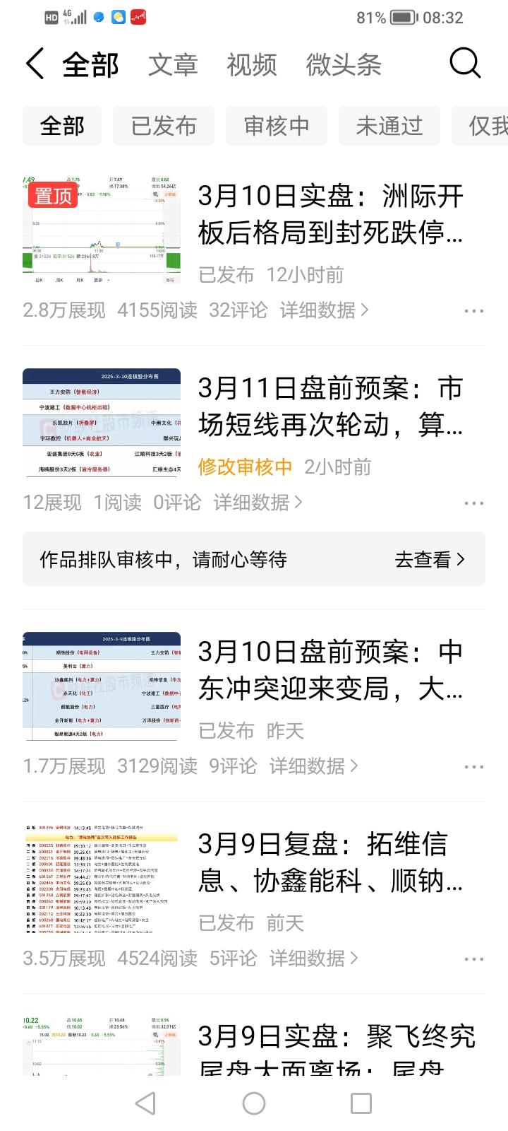3月11日盘前预案情况说明 粉丝朋友们,真的很抱歉,今天的盘前预案再次一直卡在审核中,因为小胖是临时写的,所以没有备份,想要重新查看都看不了,8点后咨询客服,一直强调在加快审核,但是从情形上看,是很难在盘前出来了,就跟上周一次类似,这里真的很抱歉!