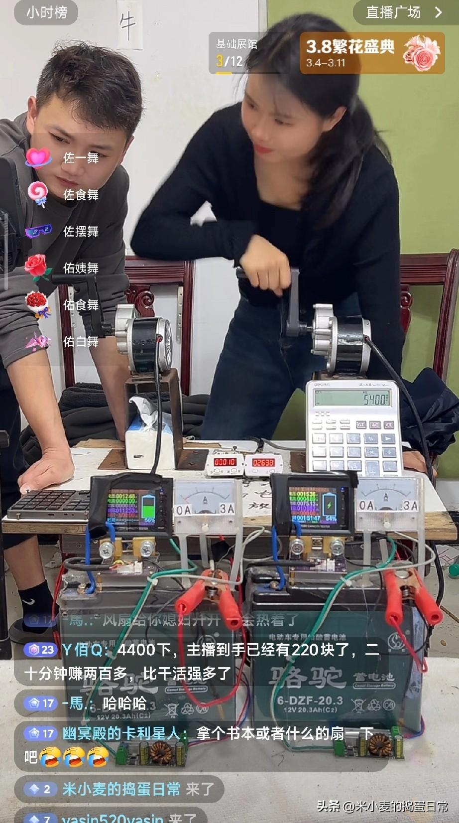 离谱!主播靠“手摇发电”直播,20分钟狂赚200多? 现在直播赚钱的路子真的越来越野了! 刷到一对夫妻直播,女主播疯狂摇着两个小电机,面前摆着两块骆驼蓄电池和一堆仪表,美其名曰“手摇发电”。弹幕里全是起哄的礼物,什么“佐一舞”“佑食舞”刷个不停,有人算了算,20分钟就赚了220块,比进厂打螺丝强多了。 旁边老公一脸心疼地看着,还得帮着看数据,网友都调侃“老公在旁边心疼媳妇的手,更心疼自己没早想到这招”。 说白了,哪是什么发电技术,就是靠卖力气博眼球。观众图个乐呵刷礼物,主播靠体力换钱,本质和以前街头卖艺没区别。 这波操作真的戳中了普通人“想轻松赚钱”的痛点:正经工作累死人,不如在镜头前摇一摇。你觉得这种直播算“勤劳致富”,还是纯纯的流量骗局?