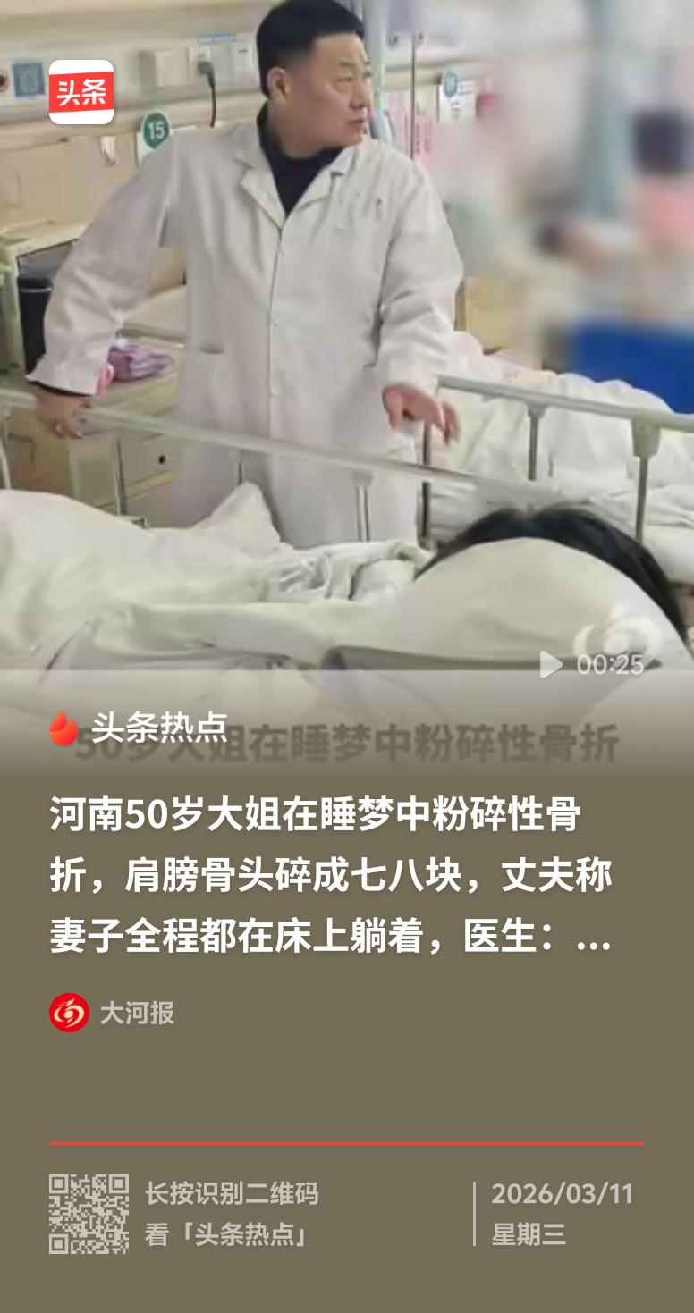 河南50岁的张大姐太惨了,睡个觉都能肩膀粉碎性骨折。事发时她丈夫听到响声,发现她目光呆滞,右臂剧痛“瘫痪”。送医检查,右肱骨近端四部分粉碎性骨折,肩膀骨头碎成七八块,关节还严重偏移。 接诊的刘涛主任从业多年都觉得蹊跷,毕竟这种骨折一般是高空坠落或车祸才会出现。经过会诊,病因竟然是癫痫发作,上肢猛烈抽搐挥舞导致骨折,这情况极为罕见。 好在医院制定了专属方案,手术成功,张大姐术后恢复顺利。这也提醒大家,一些看似不起眼的疾病,可能会引发严重后果。 老年人肱骨骨折
