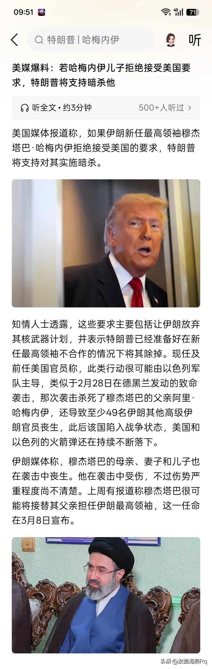 赶尽杀绝? 据网络上的消息,美国媒体透露,如果伊朗新任最高领袖穆杰塔巴,不答应美国要求伊朗放弃核武器计划,美国总统特朗普将支持对他进行暗杀。当然,暗杀的成功与否是另外一回事。 不过据网络上的多个消息说,穆杰塔巴可能在美国和以色列的袭击中曾受伤,目前似乎并不能完全承担起领导伊朗的重任,好像主要还是处于养伤和身体恢复之中。 但是,第一次发现有消息说,穆杰塔巴的妻子和儿子均在美国和以色列的袭击中丧生。因为此前的消息,虽说哈梅内伊的儿媳和孙子也遇袭身亡,但并没有表明是那个儿媳和孙子。
