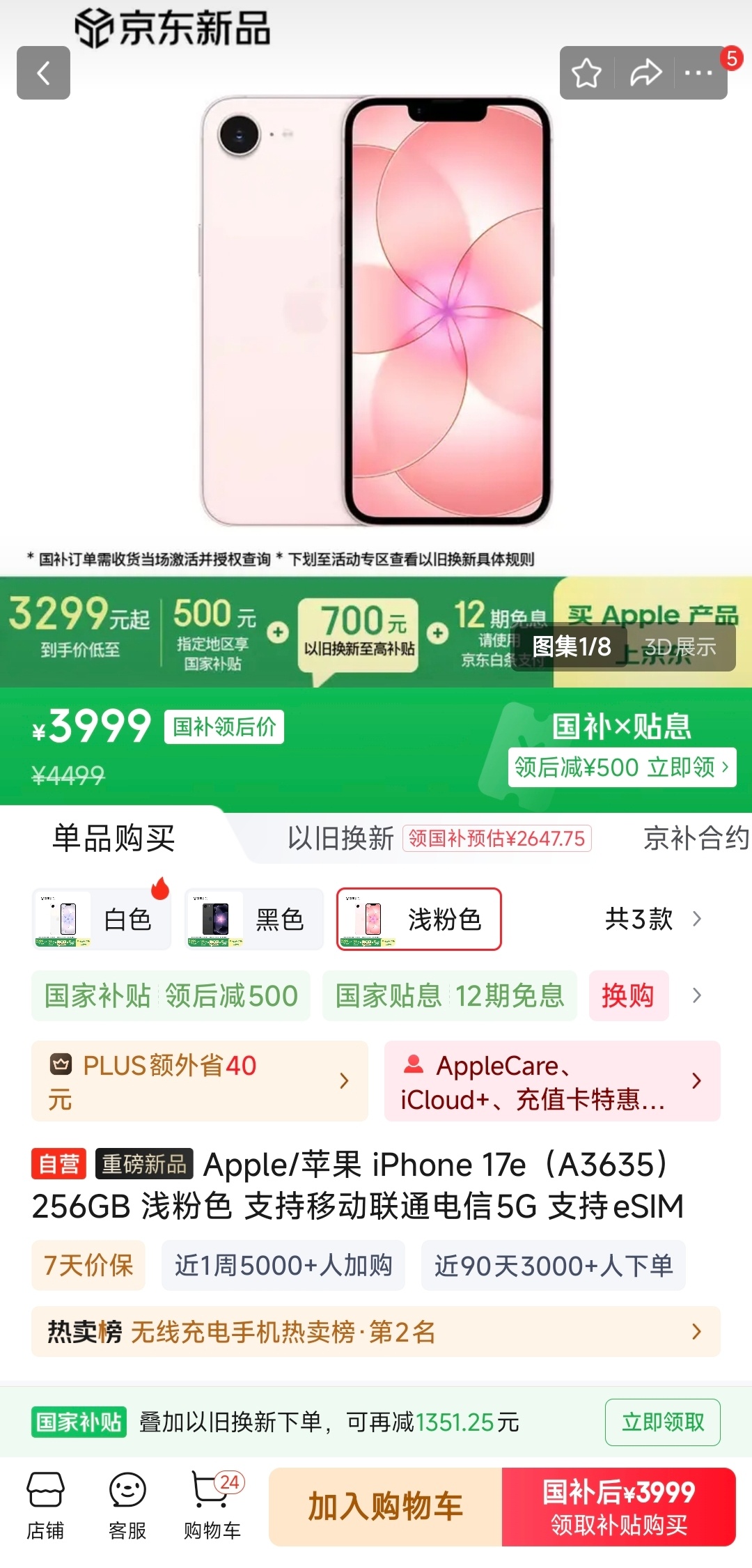 苹果最便宜手机来了iPhone 17e今天开售了!这次还新增了一款浅粉色。新机256GB版本叠加国补后3999元,有没有打算入手的