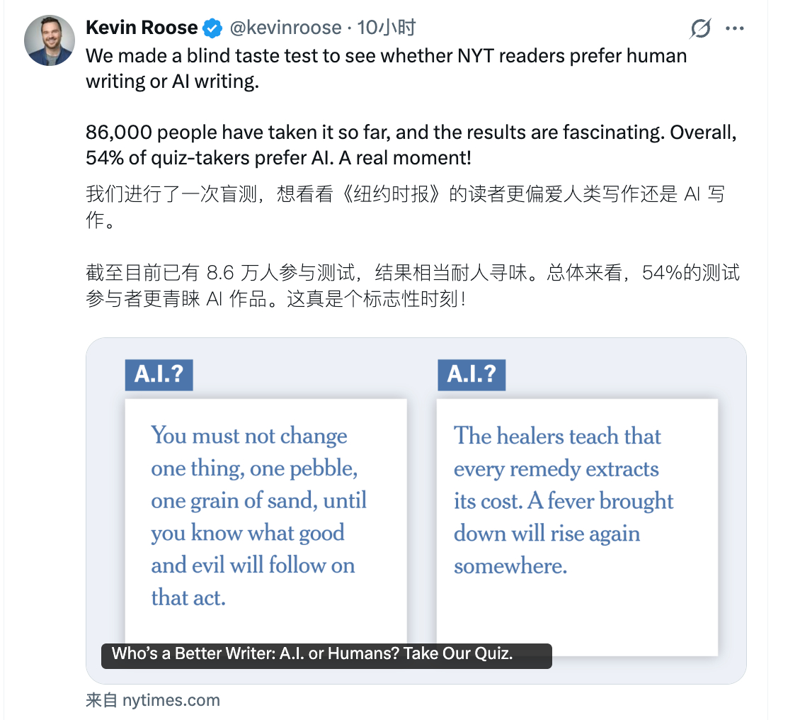 wtf,纽约时报做了一项 AI 写作与人类写作的偏好盲选测试题,有 5 道题,截止昨天, 8.6 万人参与测试,54%的测试参与者更青睐 AI 作品。