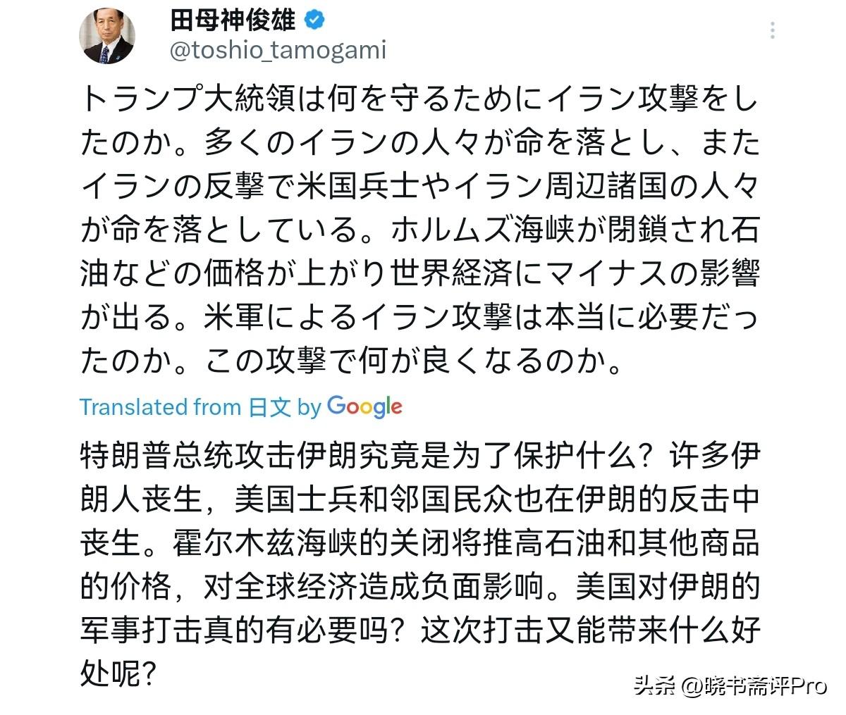 日本是真的焦虑了!日本右翼分子,前自卫队高官田母神俊雄点名批评美国!3月11日,田母神俊雄批评美国称,特朗普攻击伊朗是为了保护什么?许多伊朗人丧生,美国士兵和伊朗周边国家的人也在伊朗的反击中丧生。霍尔木兹海峡关闭,石油等价格上涨,对世界经济产生负面影响。美国攻击伊朗真的是必要的吗?这次攻击有什么好处? 很显然,这位自卫队前高官对于美国的一系列操作,明显表达了高度的质疑。当然,此人值得肯定之处是批评美国不应该攻击伊朗。但是,根本上来说,此人批评美国,绝不是为了捍卫国际法,而是此人看到了,美国贸然攻击伊朗,结果日本却在为美国的行为付出代价。在中日关系交恶的背景下,美国抽调亚太军力,日本安全顾虑大幅度上升。 而日本石油100%依赖中东,霍尔木兹海峡一封锁,日本经济直接窒息,这必然会引起日本经济一系列连锁反应。此人并不反对美国打击伊朗,而是日本右翼分子对于美国“轻易开战、无力收场”的历史教训记忆犹新,看见美国在伊朗打的拖拖拉拉,拖泥带水,以至于对日本的影响越来越大。作为看客,日本对此当然是着急上火。当然,弄不好日本右翼分子又会以美国抽调军力,日本不安全,推动更激进的扩军主张,这恐怕也是高市早苗政府打的算盘之一。