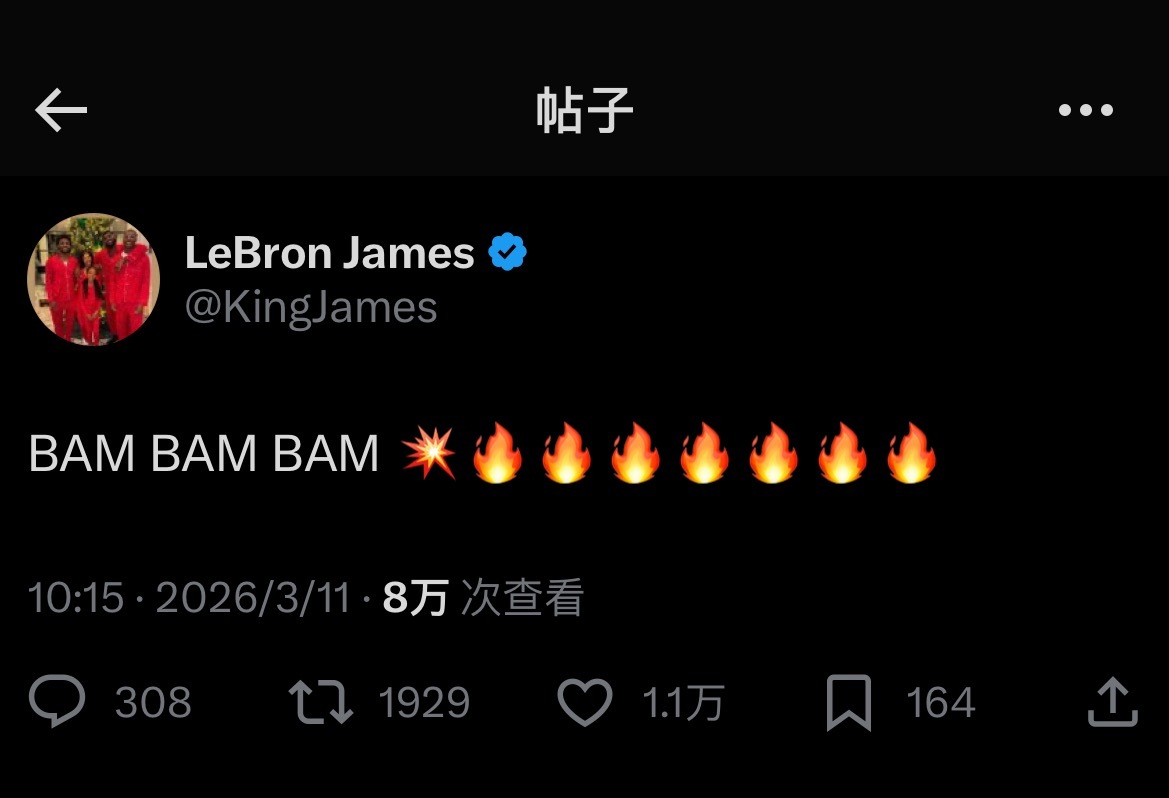 詹姆斯发文:BAMBAMBAM🔥🔥🔥🔥🔥🔥阿德巴约现役得分王