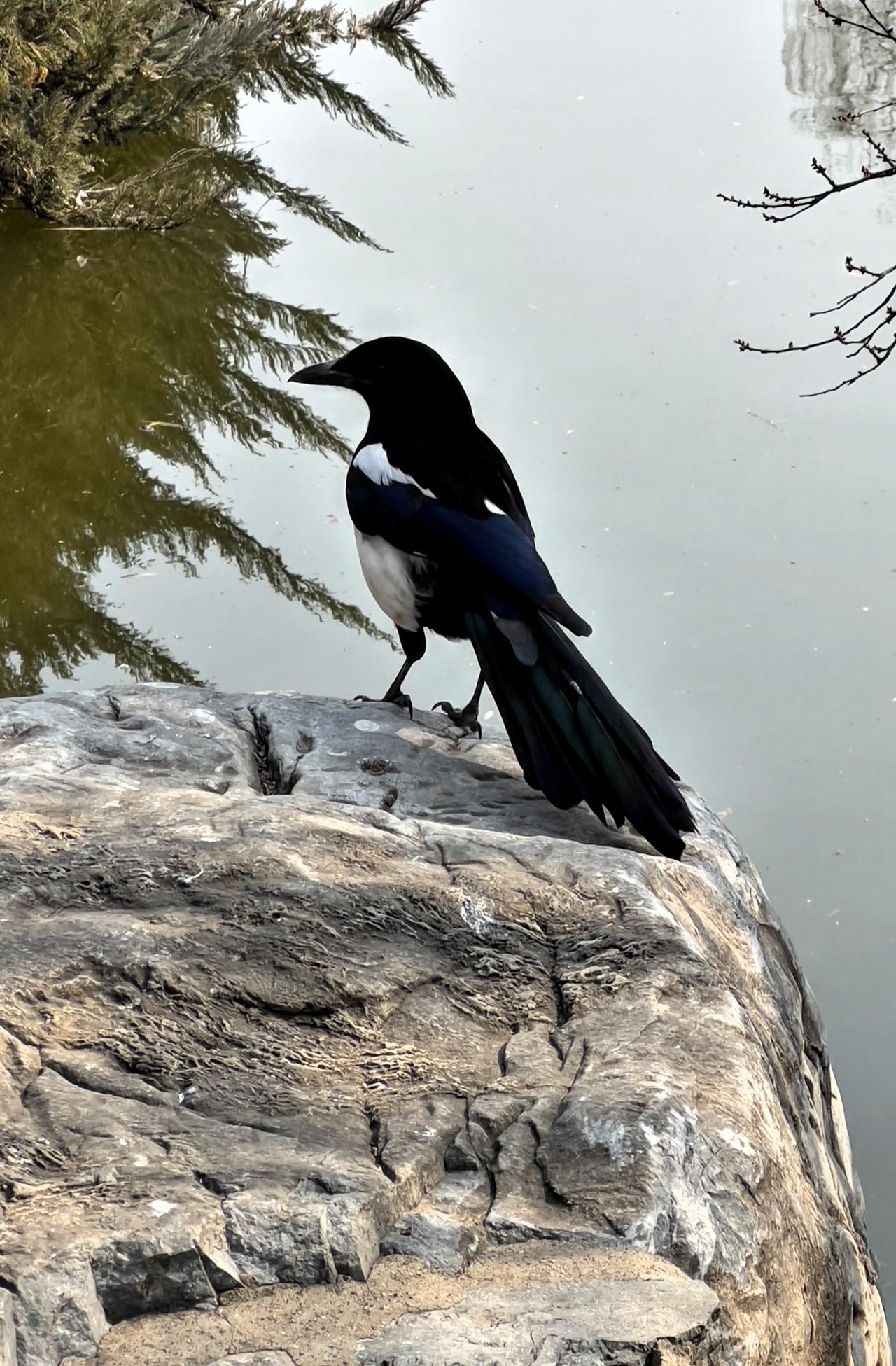 【原创】喜鹊—栖息在岩石上,静观湖面,自然之美尽收眼底。