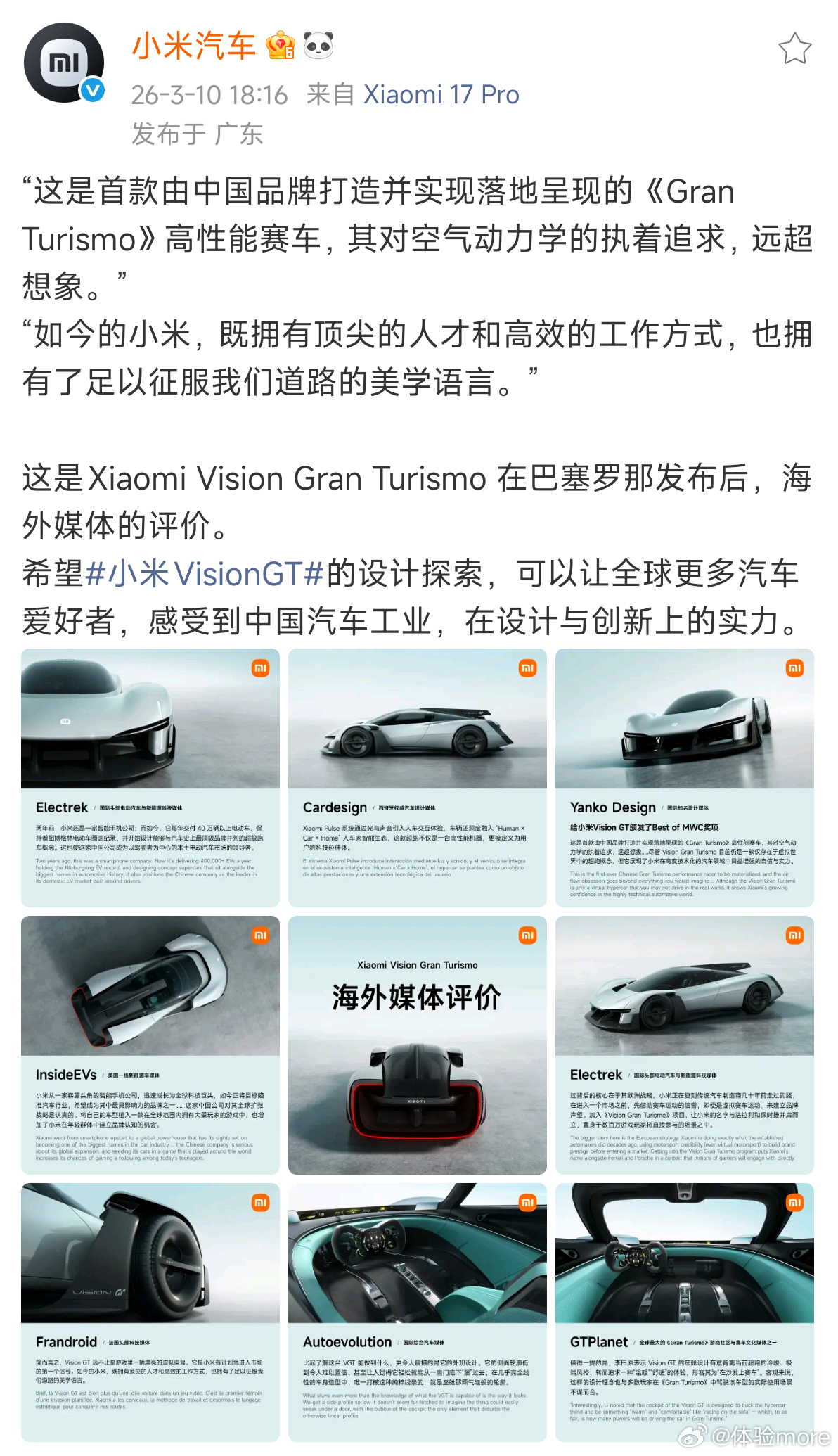 小米Vision GT在巴塞罗那MWC亮相后,我们看到这是第一个受邀参与VGT项目的中国品牌,肯定是为小米骄傲,那海外媒体是怎么说的呢?其实有实力设计与汽车史上最顶级品牌并列的概念超级跑车已经足够赢得所有人的赞叹。