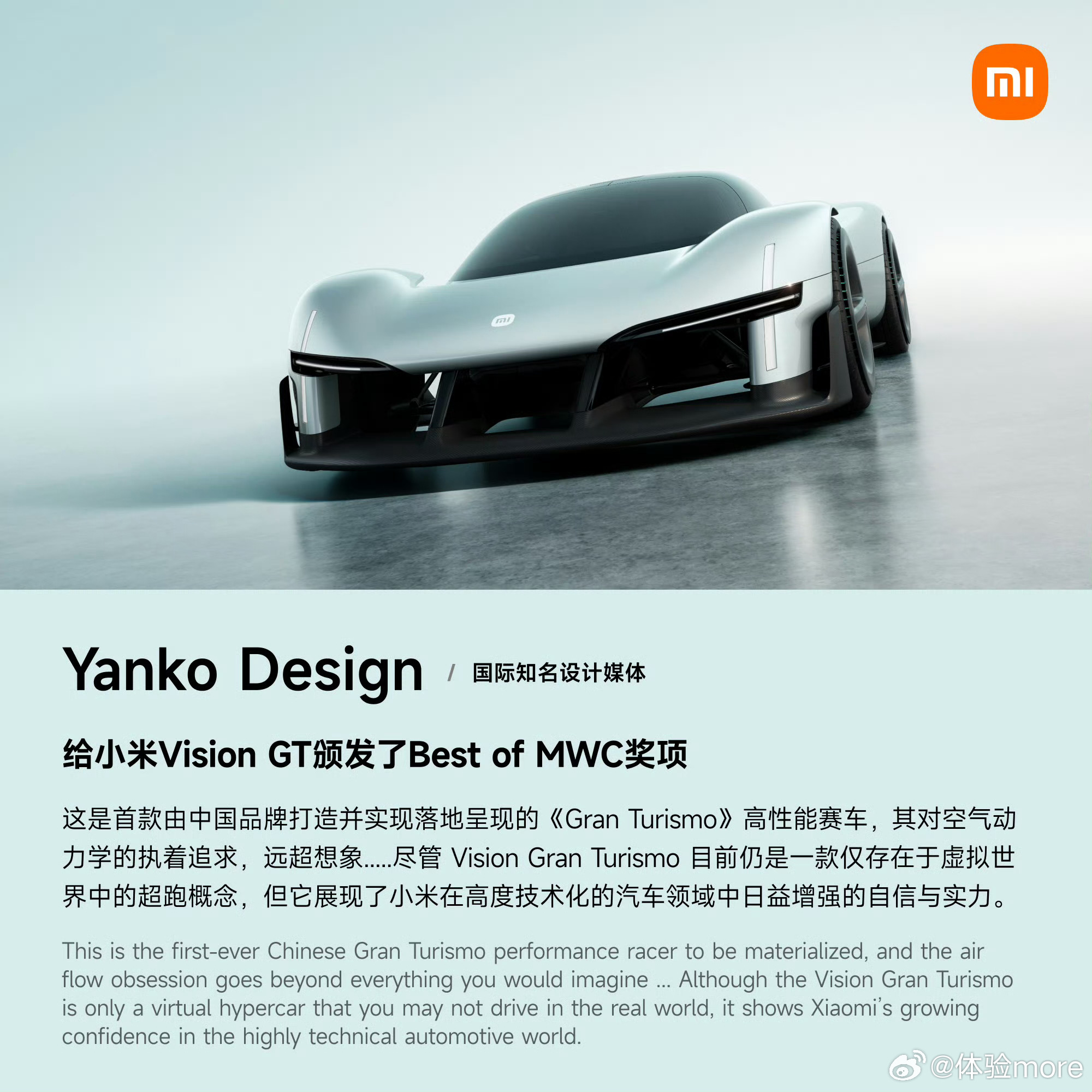 Yanko Design还给小米Vision GT颁发了Best of MWC奖项,称小米Vision GT不仅展示了小米对空气动力学的执着追求,也展现了小米在高度技术化的汽车领域中日益增强的自信与实力。