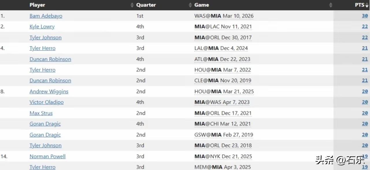 阿德巴约一战创双队史纪录 首节31分,热火队史第一,全场83分,热火队史第一 3月11日,热火150-129大胜奇才,阿德巴约首节手感火爆,单节拿到31分,创队史纪录的同时也上榜历史单节30+榜单,另外,他全场拿到83分,同样创造队史纪录,也成为了NBA历史上单场比赛第二高得分的球员。 单节30+ 大神榜(按分数从高到低) 1、37分 — 克莱·汤普森 勇士 vs 国王,2015年,第三节(历史第一) 2、34分 — 凯文·乐福 骑士 vs 开拓者,2016年,第一节 3、 33分 — 乔治·格文 马刺 vs 爵士,1978年,第二节 4、 31分 — 威尔特·张伯伦 勇士 vs 尼克斯,1962年,第四节(单场100分) 5、31分 — 阿德巴约,第一节(全场83分) 6、 30分 — 大卫·汤普森 掘金 vs 活塞,1978年,第四节 7、 30分 — 卡梅隆·安东尼 尼克斯 vs 热火,2013年,第三节 8、 30分 — 克莱·汤普森 勇士 vs 步行者,2016年,第三节 8、 30分 — 斯蒂芬·库里