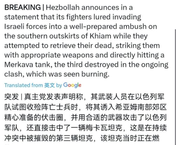 以色列军队中了埋伏,损失惨重!3月10日,黎巴嫩真主党发表声明称,以色列军队在希亚姆南部郊区进行侵略,而真主党利用打死了的以色列军人设下圈套,当以色列军人试图收回他们的死去的同伴时,真主党成员突然对这些军人发动进攻,武器袭击他们,并直接击中了一辆梅卡瓦坦克。 早在3月4日,以色列军队就已经主动进入黎巴嫩南部城镇希亚姆部署兵力,还对当地发动持续炮击,不少导弹和集束炸弹落到了民用区域,把当地的民用建筑和商业设施都炸得不成样子,这种未经允许就闯入他国领土、危害平民安全的行为,本身就是赤裸裸的侵略行径。 黎巴嫩真主党3月10日发表的声明不过是还原了事实真相,他们的反击完全是为了捍卫国家领土和民众安全,根本不存在所谓的“主动挑衅”。 真主党能成功设伏,绝非偶然而是早有准备。要知道真主党本来就是为了抵抗以色列入侵成立的组织,这么多年来一直在黎巴嫩南部经营,早就把这片区域划分成了一个个管理明确的片区,每个片区都有专门的作战人员和情报人员盯着,还配备了不容易被干扰的通信设备,就算以色列军队想切断信号搞电子干扰也没用。 他们早就摸清了以色列军队的作战习惯,知道以军在战场上有回收阵亡士兵遗体的惯例,所以才会利用这个特点设下圈套,先在正面冲突中打死部分以军士兵,然后埋伏在周边等待援军到来。这种战术看似简单,却精准抓住了对手的软肋,充分说明真主党不是盲目抵抗,而是有着清晰的战术规划和对敌人的深刻了解。 更关键的是,真主党根本不是外界想象中那种装备落后的游击队,他们的作战实力早就今非昔比。这次能直接击中以色列的梅卡瓦坦克,就是最好的证明。 梅卡瓦坦克是以色列军队的主力主战坦克,一直以防护性强著称,可真主党用专门针对坦克的精准武器,一下就命中了目标,这背后离不开他们装备的先进制导武器,还有前期通过各种渠道搜集到的关于这款坦克的详细信息。 而且真主党不仅有全职的作战士兵,还有大量后备人员,平时在当地民众中也有深厚基础,很多当地人愿意给他们提供情报,所以才能精准掌握以军的行动路线和时间,在最合适的时机发动袭击。 以色列军队这次损失惨重,其实早就埋下了伏笔。从3月2日开始,以色列就对黎巴嫩全境发动了大规模袭击,短短几天就轰炸了320多个目标,导致黎巴嫩方面上百人死亡、几百人受伤,这种不分青红皂白的狂轰滥炸,不仅没打垮真主党的抵抗意志,反而激起了更多人的愤慨。 更重要的是,以色列当时还在同时对伊朗发动打击,属于双线作战,兵力和精力都被分散了,在黎巴嫩南部的行动自然就出现了漏洞。他们以为凭借自己的装备优势,进入希亚姆后就能为所欲为,却没想到真主党早就做好了充分准备,把他们的侵略路线变成了伏击战场。 真主党的这次行动,本质上是对以色列持续侵略的正义反击。这些年以色列一直在中东地区奉行扩张政策,多次入侵黎巴嫩领土,掠夺资源、残害平民,而真主党作为黎巴嫩的主要力量,一直站在抵抗侵略的最前线,他们的行动不仅得到了黎巴嫩民众的支持,也获得了地区内不少国家的理解。这次设伏成功,不仅让以色列军队付出了人员和装备的惨重代价,更打击了他们的嚣张气焰,让他们明白侵略行为从来都不会有好结果。 以军试图回收阵亡同伴遗体的行为看似是出于所谓的“人道主义”,但结合他们之前的侵略行径来看,这种行为背后更多的是想维护军队形象,可他们却忽视了在他国领土上作战的风险,也低估了真主党的作战能力和抵抗决心。真主党选择在这个时机发动袭击,既达到了反击侵略的目的,也向外界传递了明确的信号:任何国家都不能随意侵犯黎巴嫩的领土主权,否则必将遭到坚决反击。 从整个地区局势来看,以色列的侵略行为一直在加剧中东的动荡,这次中埋伏不过是其一系列错误行为的一个缩影。他们一边在黎巴嫩南部搞军事扩张,一边还要对伊朗发动打击,这种四处树敌的做法,只会让自己陷入更被动的局面。 而真主党的抵抗,不仅是为了保卫自己的国家,也是在遏制地区冲突的进一步升级,毕竟如果任由以色列的侵略行为持续下去,只会有更多无辜平民遭殃,整个中东地区都会陷入更大的战乱。 总的来说,以色列军队这次中埋伏损失惨重,完全是咎由自取。他们主动入侵黎巴嫩领土,践踏他国主权,必然会遭到顽强抵抗。真主党的设伏行动,是基于对敌人的充分了解、周密的战术部署和先进的作战能力,是正义的自卫反击。这一事件也再次证明,任何凭借武力进行侵略扩张的行为,最终都会遭到失败,而维护国家领土主权的正义力量,终将得到支持和胜利。