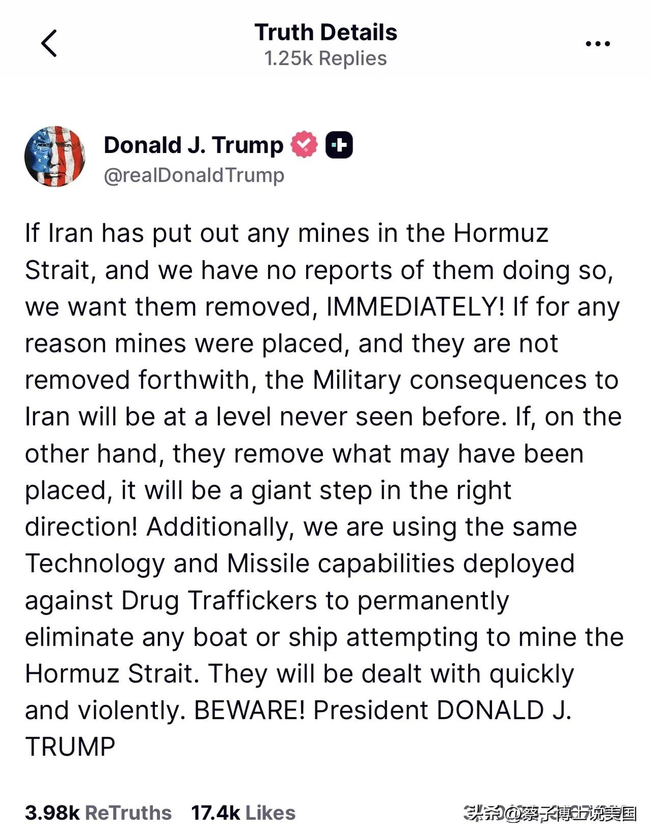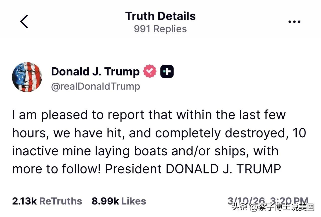 【杜大师认为马桶坏了,还能打伊朗吗?】 特朗普告诉他,不仅打完了,还警告伊朗,敢于在霍尔木兹海峡布置水雷,那就不要怪我不客气。 同时将布置水雷的快艇一一击沉。 希望伊朗立刻销毁布置的水雷。 不知杜大师该有何感想,每次视频都被打脸,依旧孜孜不倦做视频,这叫什么?