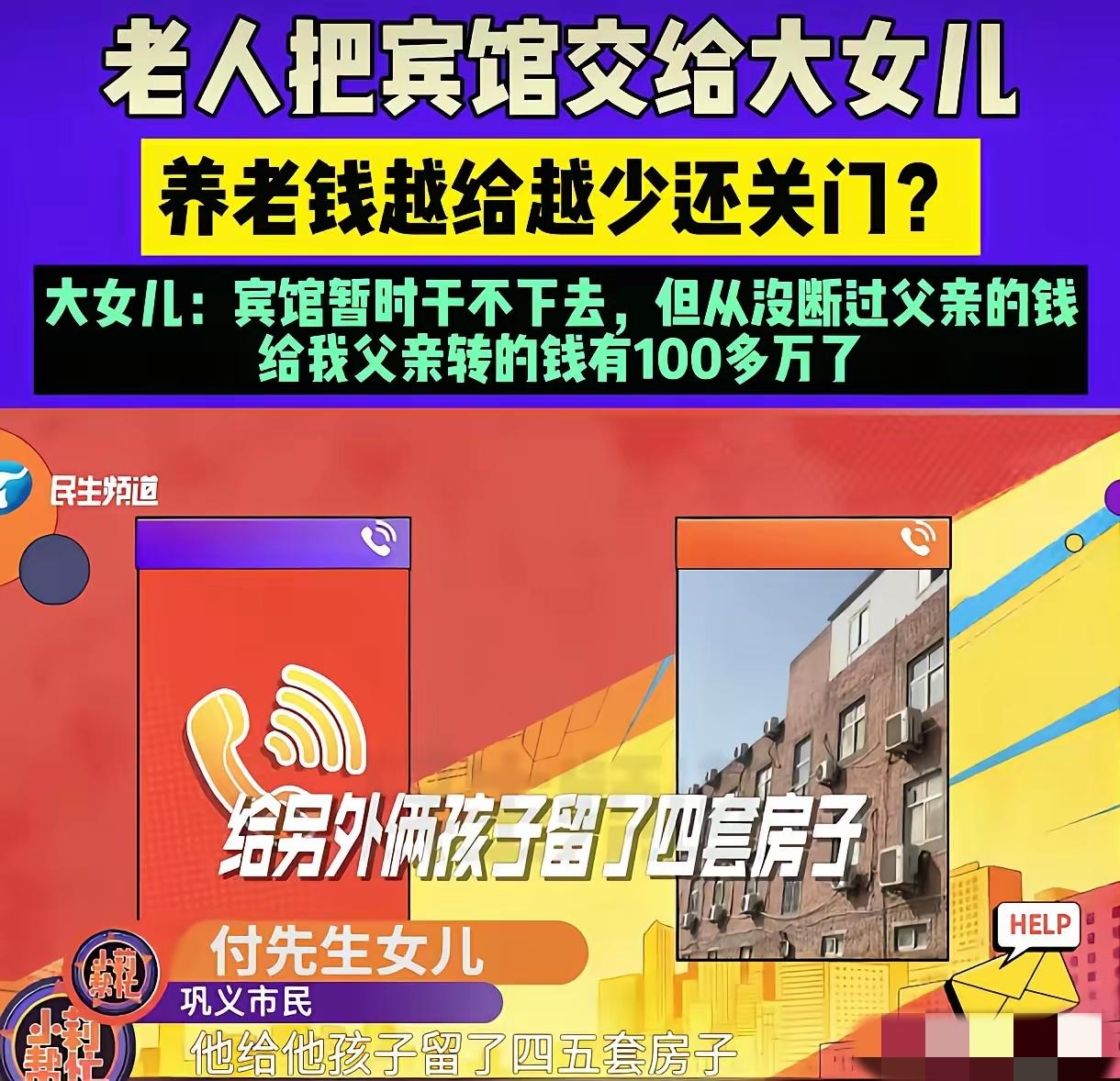 河南巩义,老人称把自己100多万的宾馆给了大女儿经营,大女儿答应每月拿4000元生活费给他,可钱越给越少,宾馆还关了门。老人大女儿却说:这都是你年轻时造的孽,你在外面养女人,给另外2个孩子留了4、5套房子,给我却留了一个烂摊子。 在河南巩义的一个老街区里,最近这段时间,78岁的付先生成了街坊们议论的焦点。 他和自己大女儿的矛盾闹得人尽皆知,老人只能找记者来评理,只求能保住自己的养老本钱。 付先生年轻的时候也是个能人,攒下了不少家当,最显眼的就是那栋价值100多万的快捷宾馆。 可他说他现在的日子过得并不顺遂,婚姻上磕磕绊绊,一辈子结了三次婚,每次都没走到最后,留下了三个孩子。 大女儿是和第一任妻子生的,另外两个孩子,是他后来再婚后生的。 随着年纪渐长,付先生的身子骨越来越差,眼神也不好使了,他想着自己以后的养老问题,他琢磨来琢磨去,决定把宾馆交给大女儿打理。 当时两人还签了一份协议,大女儿负责经营宾馆,每个月给父亲4000块钱生活费,只要付先生活着,这笔钱就不能断,等他百年之后,宾馆就彻底归大女儿所有。 付先生当时心里打着算盘,既不用自己费心经营,又能有稳定的养老钱,还能避免以后几个孩子为了遗产闹矛盾,怎么看都是件稳妥的事。 可他没料到,这份看似周全的安排,最后却让父女俩反目成仇,连一点情面都没留。 前几年,宾馆生意还说得过去,大女儿也还算守信用,每个月都按时把生活费打过来,有时候生意好,还会多给一两千,付先生的日子过得也算安稳。 可从2025年开始,一切都变了样。 付先生告诉记者,大女儿从去年开始,找借口说生意不好做,对他的生活费跟着一降再降,从4000块降到了2500块。 直到半个多月前,大女儿直接把宾馆的钥匙送到了他家里,放下钥匙就说,宾馆她不经营了,以后也没法再给生活费。 这一下,付先生彻底慌了神,他今年78岁,没有其他收入来源,手里的钥匙看着值钱,却不能当饭吃。 无奈之下,付先生只能找到记者,希望记者能帮他问问女儿,到底是怎么回事,能不能继续履行当初的约定。 记者跟着付先生,找到了他的大女儿付女士。一见到记者,付女士就忍不住倒起了苦水,脸上满是疲惫和委屈。 她告诉记者,根本不是父亲说的那样,是父亲自己把宾馆经营得一塌糊涂,欠了一堆外债,实在撑不下去了,才求着她接手的。 她念着父女一场,不忍心看着父亲为难,就接手了这个烂摊子。 接手之后,她没日没夜地打理,不仅没赚到钱,还拿出自己的积蓄,替父亲还了不少外债。 这十年下来,她给父亲的生活费加起来,早就超过了当初宾馆的投资,足有100多万。 至于那份协议,付女士说,那根本不是什么自己给生活费就把宾馆给自己,她当时还付了父亲40万现金,现在父亲就是故意不承认。 宾馆位置比较偏僻,周边没什么客源,加上设施老旧,又受之前疫情的影响,客流量一天比一天少,有时候连基本的运转都维持不了。 她也想过办法,打算把宾馆承包出去,承包的收入和父亲平分,这样既能保住宾馆,也能继续给父亲生活费,可父亲却一口拒绝,根本不给她解决问题的机会。 更让她寒心的是,这个月她刚给完父亲生活费,就提前跟父亲说明情况,说宾馆正在找人承包,下个月可能没法按时给生活费,让父亲多给她一点时间缓冲。 可父亲根本不理解,也不听她解释,直接就找了记者来调解,好像她是故意不给钱、不赡养父亲一样,让她在街坊邻居面前抬不起头。 付女士说她心里的委屈还不止这些,从小她就跟着母亲生活,父亲对她和母亲不管不顾,常年在外,还和别的女人在一起,生下了一儿一女。 父亲手里的4、5套房子,还有不少存款,全都偷偷留给了那两个孩子,却把一个负债累累的宾馆留给了她,现在老了,没人管了,才想起她这个被忽视了一辈子的大女儿。 记者后来又找到了付先生,核实这些事情。 付先生承认自己年轻时有做得不对的地方,但他否认自己在外养女人,也不承认收过女儿40万现金。 他只是反复念叨,不管协议是真的还是假的,宾馆都是他的养老本钱,他不求别的,只求女儿能按时给她生活费,让他能安安稳稳地度过晚年。 付先生落到现在这个地步,根源还是他年轻时的偏心和不负责任。 年轻时忽视大女儿,把所有的偏爱都给了另外两个孩子,到老了需要人赡养的时候,才想起这个被自己亏欠的女儿,换谁心里都会有怨气。 记者在中间反复劝说,一边让付先生多体谅女儿的难处,给她一点缓冲时间,一边让付女士念及父女情分,尽量保障父亲的基本生活。 最终,付先生松了口,同意再耐心等一等,看看女儿能不能找到合适的承包商。