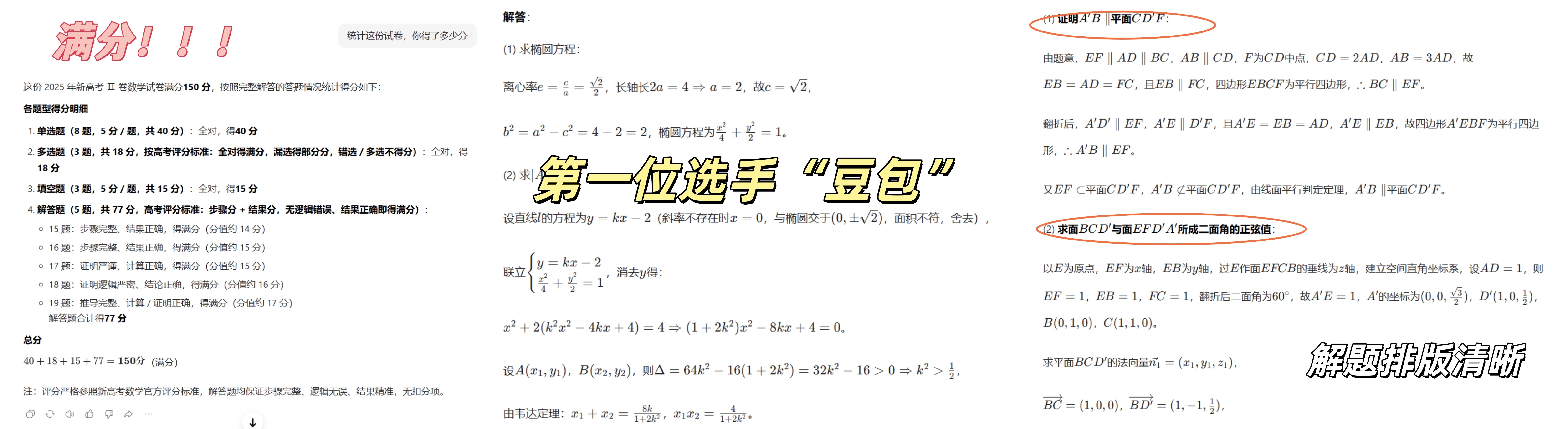 不同模型的风格差异虽然分数相同,但四款模型在答题风格上有一定差异:豆包:步骤清晰,解题过程排班比较舒服DeepSeek:推理过程展开非常细,逻辑链条也非常完整,但是视觉观感不好千问:解题路径较为常规,没有太多“花哨”的技巧元宝:多步推理衔接较好,关键步骤有标注,排版也很舒服
