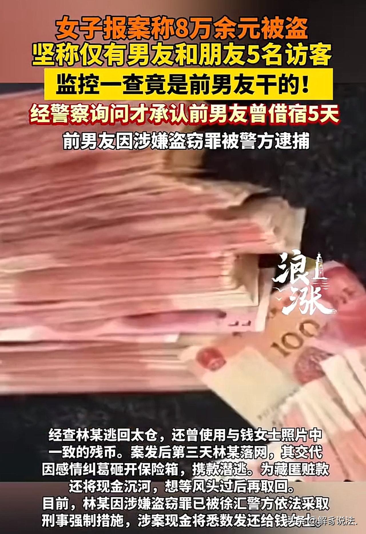“引狼入室!”上海,一女子向警方报案,说家中保险箱被砸了,83400元现金不翼而飞。民警接到报案后,赶紧去现场侦查,发现女子家门窗都没有被撬的痕迹,怀疑熟人作案的可能性最大,可女子坚称家里只有现任男友和4位好友来过,再无其他人来过。民警一一做了排查,确认不是几人。随后,民警调取了监控,发现女子说谎了,除了她交代的5人来过其家里,还有1人来过,这个人正是盗窃者。 近日,上海徐汇警方接到市民钱女士的报警电话,电话里她又急又气,说家里保险箱被人砸开,里面83400元现金全都不见了,请求民警赶紧帮忙破案。 接到报警后,民警立刻赶往钱女士家中勘查。 现场门窗完好无损,没有被撬的痕迹,只有保险箱被硬生生砸坏,一看就是熟人下手,外人根本摸不准保险箱的位置。 面对民警的询问,钱女士一口咬定近期只有现男友和四位朋友来过家里,一共五个人,全是信得过的人,绝对没有别的外人。 民警随后对这5名访客逐一进行排查,却未发现任何有效线索,案件调查一度陷入僵局。 但民警没有轻易放弃,抱着不放过任何细节的态度,调取了小区和楼道的全部监控。 这不看不知道,一看直接揭开了大谜团:画面里清清楚楚出现了钱女士的前男友林某,不仅多次进出她家,案发当天还拎着好几个袋子走进消防通道,在里面待了快20分钟,楼道里还传来哐当的砸东西声。 等林某再出来,手里就剩一袋垃圾,其他东西全没了踪影。 民警拿着监控再次找到钱女士,铁证面前,钱女士脸一下子红了,这才支支吾吾说出实话:前男友林某其实在她家借宿了5天,她怕现男友知道了闹矛盾,才故意隐瞒不说。 随后民警忙活了一整天,在周边翻找,终于找到了被林某扔掉的保险箱,案子一下有了突破口。 顺着线索追查,民警发现林某作案后逃到了江苏太仓,还花过和钱女士描述一致的残币。 案发仅三天,林某就被成功抓获。 面对审讯,林某如实交代,因为和钱女士有感情纠纷,心里憋着气,就趁借宿的机会砸开保险箱偷了钱,跑路后还把现金沉到河里,想等风头过了再取出来。 《刑法》第264条规定:盗窃公私财物,数额较大的,或者多次盗窃、入户盗窃、携带凶器盗窃、扒窃的,处三年以下有期徒刑、拘役或者管制,并处或者单处罚金;数额巨大或者有其他严重情节的,处三年以上十年以下有期徒刑,并处罚金;数额特别巨大或者有其他特别严重情节的,处十年以上有期徒刑或者无期徒刑,并处罚金或者没收财产。 结合本案,林某以非法占有为目的,砸开保险箱秘密窃取83400元现金,数额达巨大标准(3万元至10万元以上),已构成盗窃罪。 其作案后潜逃、损毁赃款(沉河)等行为,属于加重情节,量刑幅度将在三年以上十年以下有期徒刑,并处罚金。 目前,林某因涉嫌盗窃罪已被警方依法采取刑事强制措施,被盗的83400元现金也将悉数发还给钱女士。 钱女士已经有了现任,还把前任留在家中住五天,既想稳住现任,又舍不得断干净,典型的“吃碗看锅”。 她以为是人情,实则是引狼入室,最终被盗8万多,还对警方隐瞒实情,纯属自找麻烦。 感情里最忌讳拖泥带水,不懂得划清界限,最后只会钱没了、信任碎了、现任也凉了。 这不是倒霉,是自己给自己埋雷,搬起石头砸自己的脚,一点不值得同情! 欢迎关注@解豸说法.