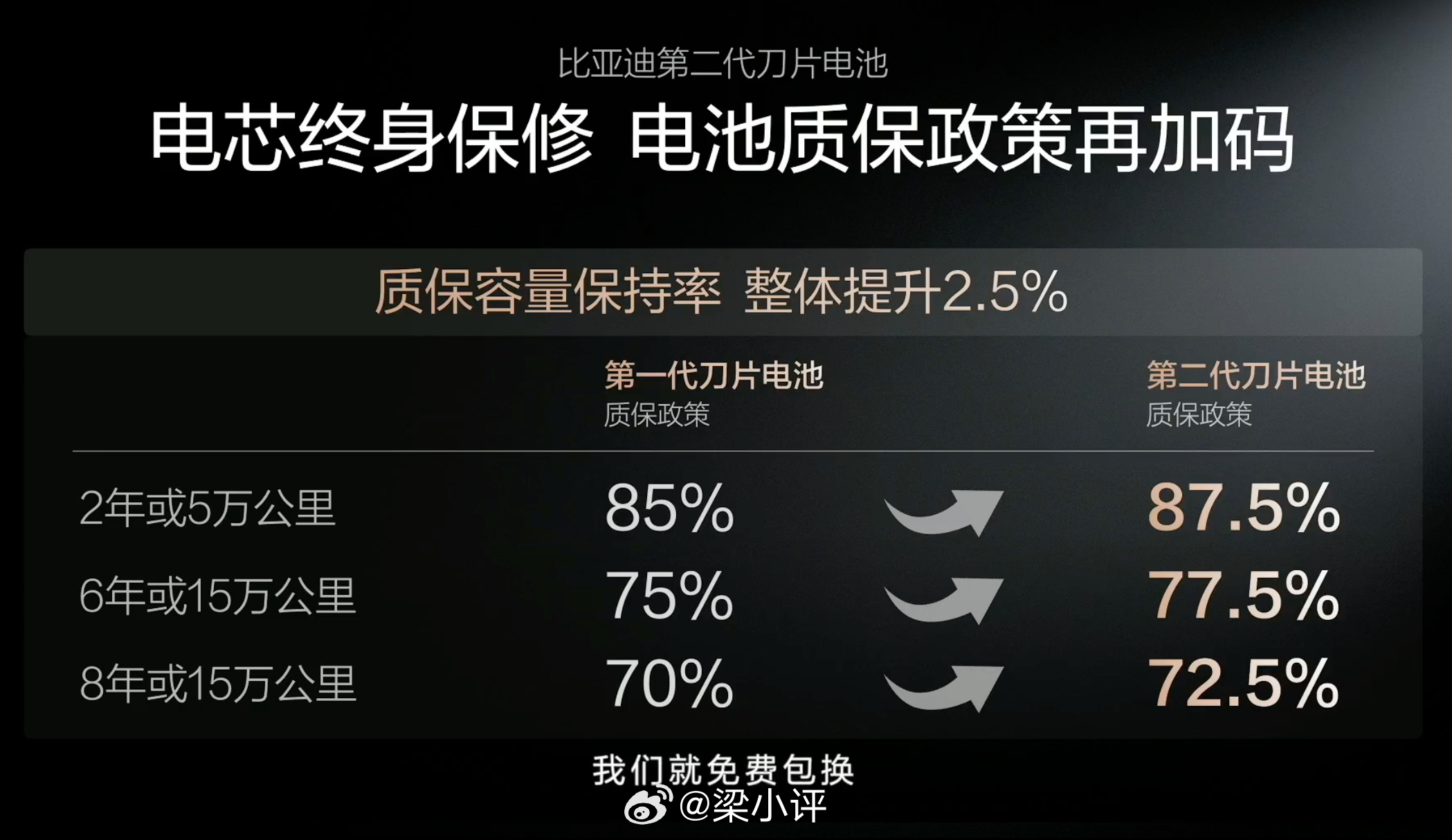 基于对第二代刀片电池有足够的自信,比亚迪宣布电池质保政策再加码!第二代刀片电池质保的“容量保持率”整体提升2.5%,电池容量低于77.5%就免费包换,电芯依旧是“终身保修”。