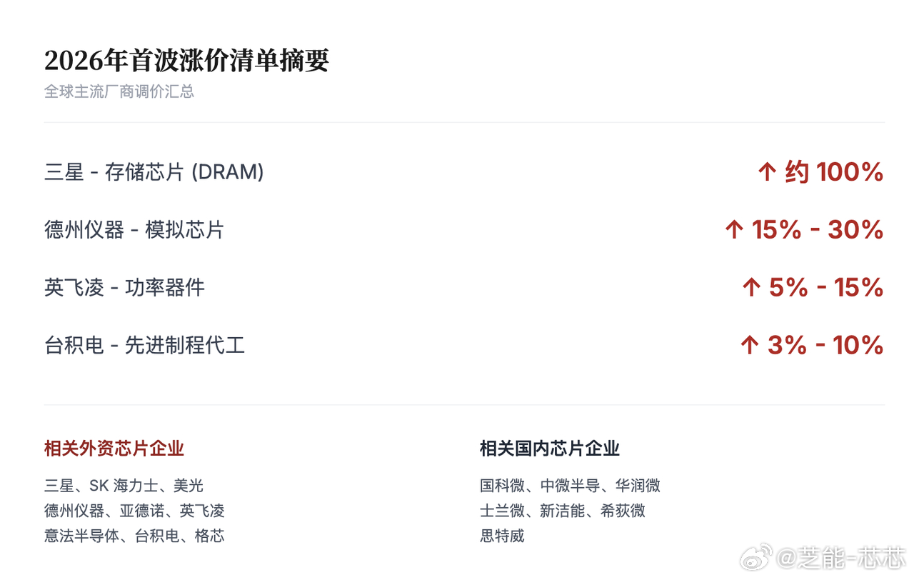 2026 年开年,全球半导体迎来全产业链涨价潮,存储、功率、模拟芯片及晶圆代工同步提价,海外巨头主导本轮行情。