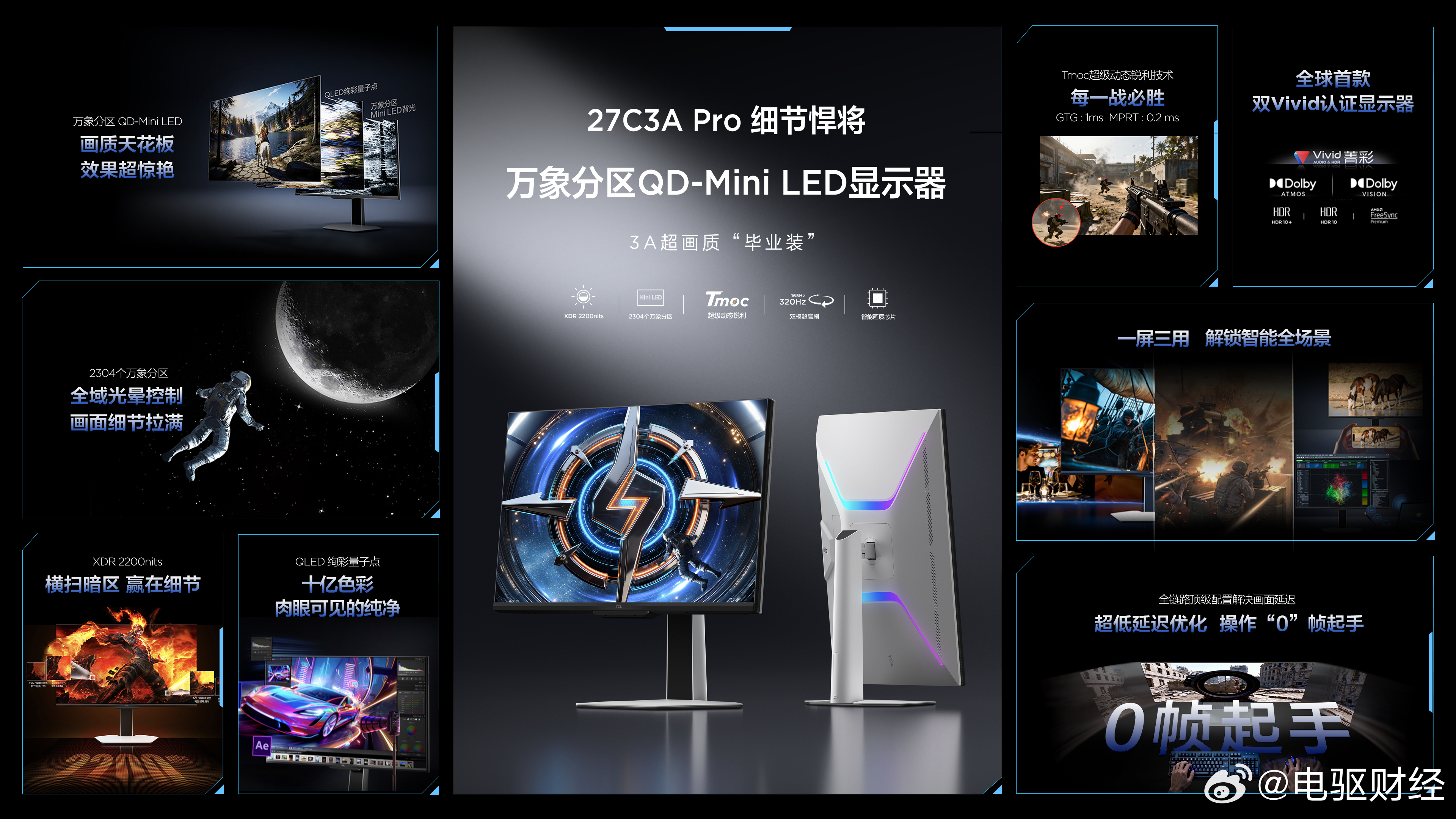 “细节悍将”27C3A Pro专为3A画质狂热者打造,将Mini LED的开创者优势浓缩于桌面方寸之间。2304个万象分区、XDR 2200尼特亮度、QLED绚彩量子点,这三大升级是对Mini LED显示器发光成像全链路的革新。在《黑神话·悟空》中出现的星空场景,C3A Pro边缘清晰锐利无光晕,暗场黑得纯粹,亮部细腻通透。这套精准控光系统源于完整的“光链路”升级:从发光效率更高的“聚核光芯”,到精准聚光的“超聚光微透镜”,再到优化光路的紧凑混光结构,配合TCL华星顶级HFS Shoot屏技术与TCL自研控光算法,最终实现“一区顶多区”的极致控光效果。XDR 2200尼特峰值亮度带来细节拉满的持久细腻亮,QLED绚彩量子点技术实现99% DCI-P3色域覆盖。作为甜品级配置产品,还搭载了Tmoc超级动态锐利技术,轻松切换FPS竞技场,高速画面无拖影不模糊。此外,作为全球首款获得HDR Vivid & Audio Vivid双认证的显示器,C3A Pro可谓是当下高画质游戏党的“版本毕业答案”。