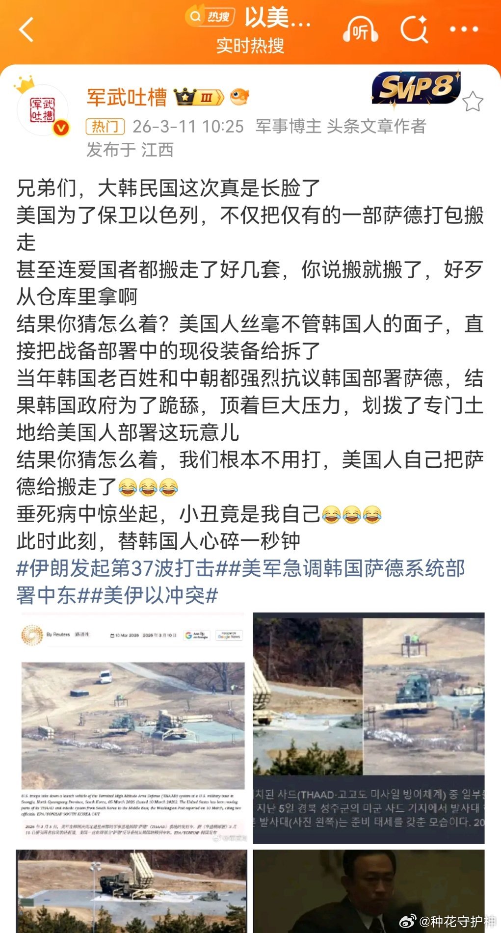 这次事件的讽刺性和严重性恰恰就在于:因为仓库没货,美国只能“拆东墙补西墙”,直接把韩国头顶正在使用的“保护伞”强行拆走运往中东。 这不是调用闲置资产,而是直接让韩国“裸奔”来支援以色列,这也解释了为什么韩国舆论和政界反应如此激烈——面子(被无视)和里子(防空真空)都丢了。