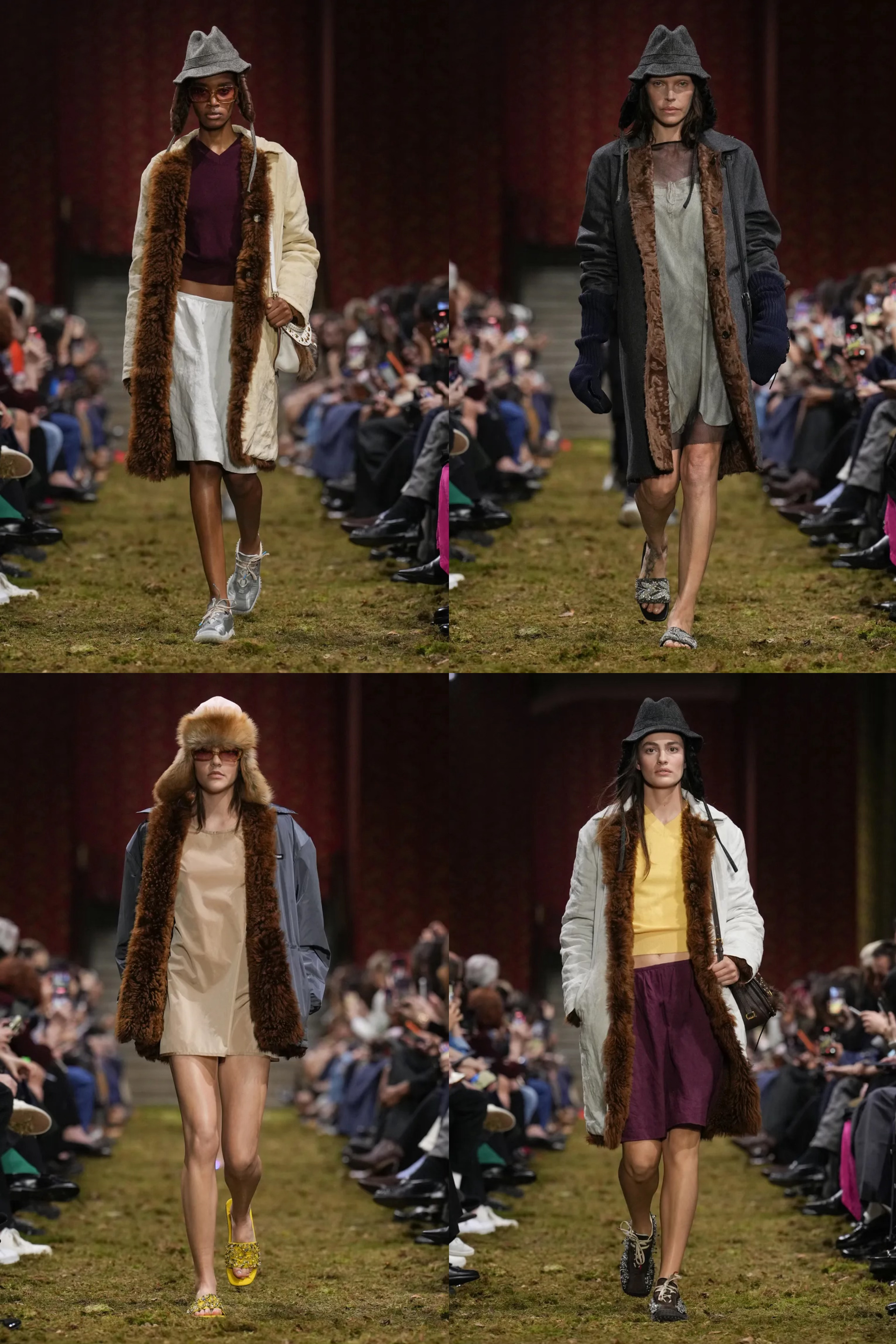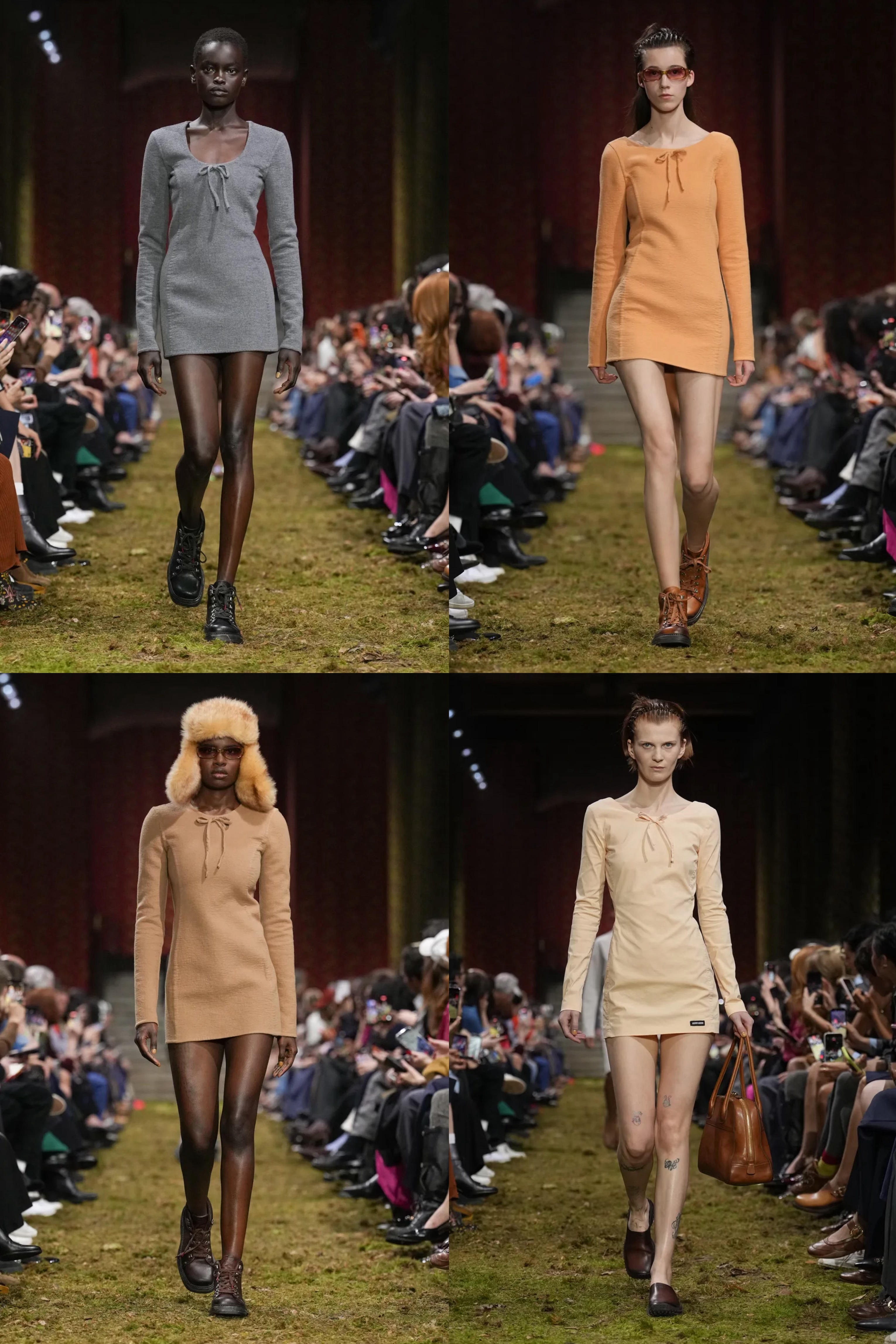 Miu Miu 2026秋冬系列时装秀于巴黎 Palais d’Iéna 发布,在模拟户外的草地上,夹杂着落叶与野草,模特们身穿羊毛束腰套装、戴着毛绒雷锋帽走来。品牌大使刘浩存、李庚希现身秀场头排,赵今麦出镜预告大片,崔然竣惊喜贡献 T 台首秀,为巴黎时装周增添别具一格的魅力色彩。