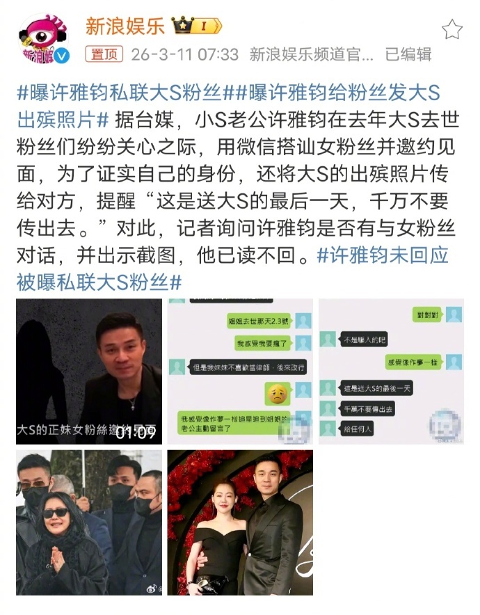 曝许雅钧给粉丝发大S出殡照片曝许雅钧私联大S粉丝之前说台湾是表面开放进步,实则比大陆更封建传统保守,很多人还不信。关注台娱的都知道,就小S老公许雅钧的那些行为,什么出轨、夜店、家暴、嫌弃小S生不出儿子,还有个儿子私生子的传言...放大陆任何一个男明星、或女明星老公身上,早就被网暴得查无此人了,但是在对岸就根本不受影响,甚至每次丑闻还要靠小S出面解释,这就是两岸舆论最大的区别,
