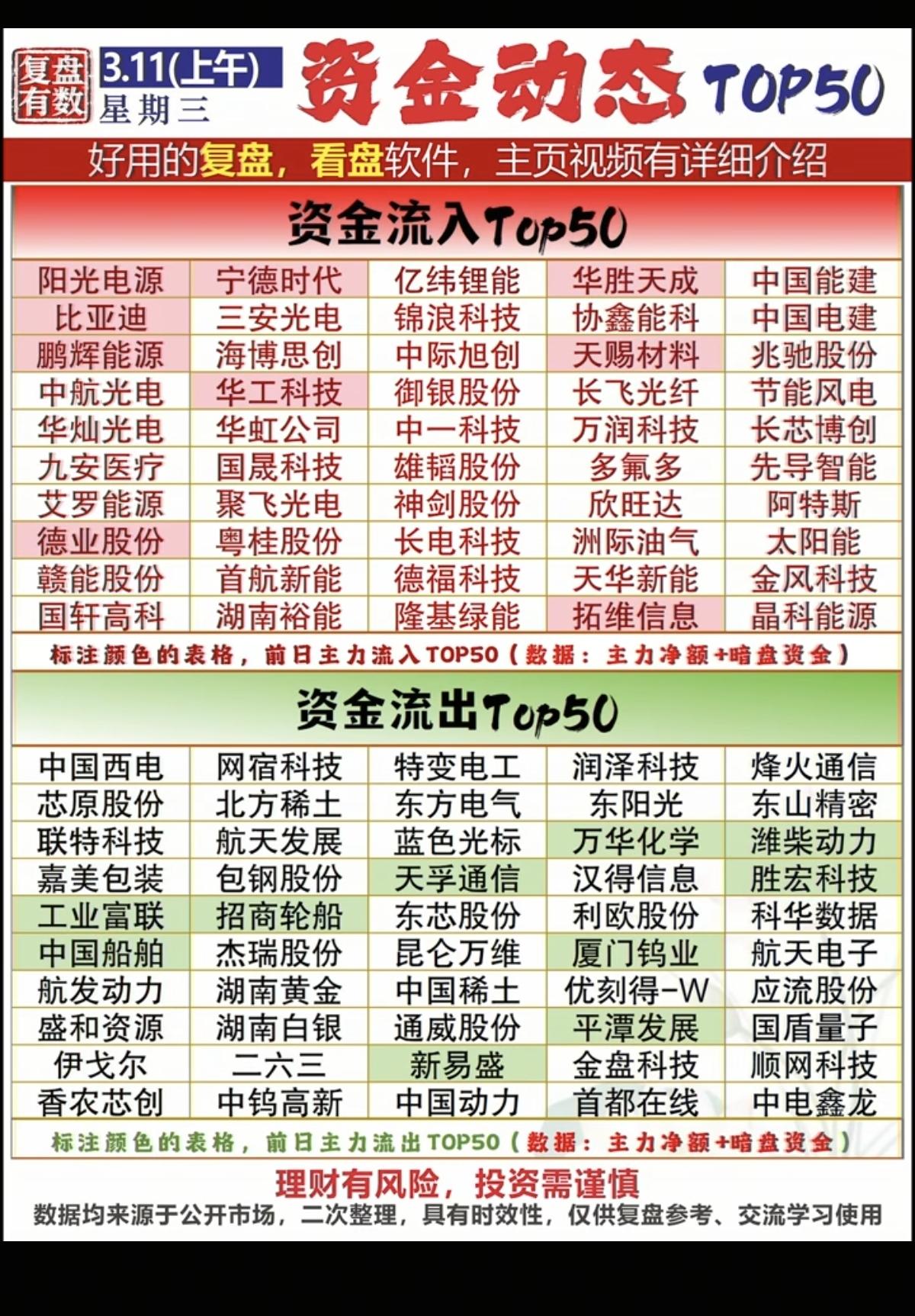 3.11周三 主力资金 抢筹出逃个股榜! 资金抢筹: 1.电池相关 2.光伏设备 3.电力设备 4.其他电源设备 5.能源金属 资金出逃:稀土永磁、航天航空、地面兵装、广告营销、船舶制造等